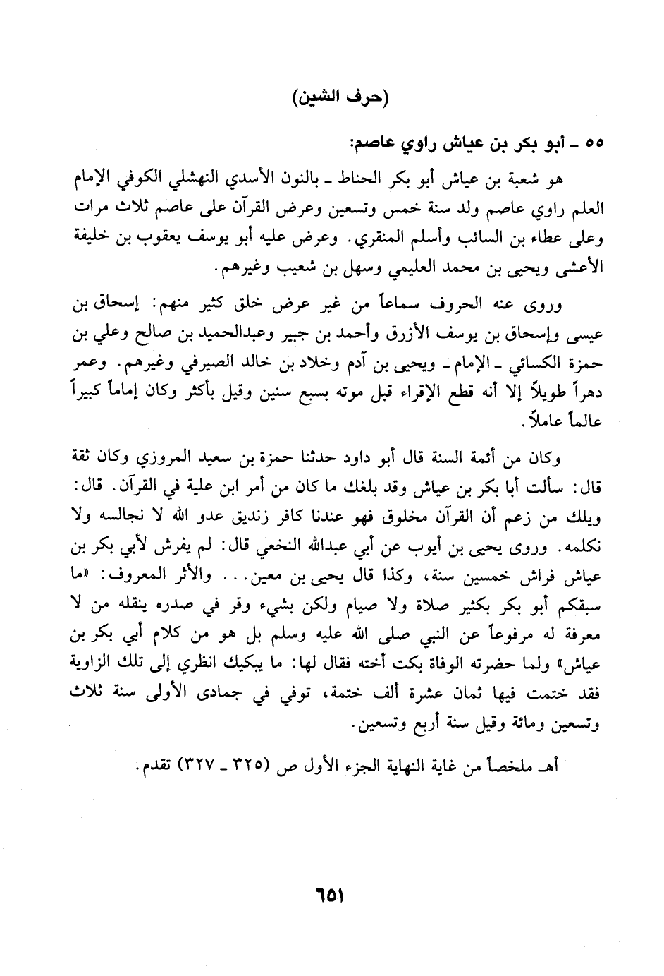 هو شعبة بن عياش أبو بكر الحناط -بالنون الأسدي النهشلي الكوفي الإمام العلم راوي عاصم ولد سنة خمس وتسعين وعرض القرآن على عاصم ثلاث مرات وعلى عطاء بن السائب وأسلم المنقري. وعرض عليه أبو يوسف يعقوب بن خليفة الأعشى ويحيى بن محمد العليمي وسهل بن شعيب وغيرهم.