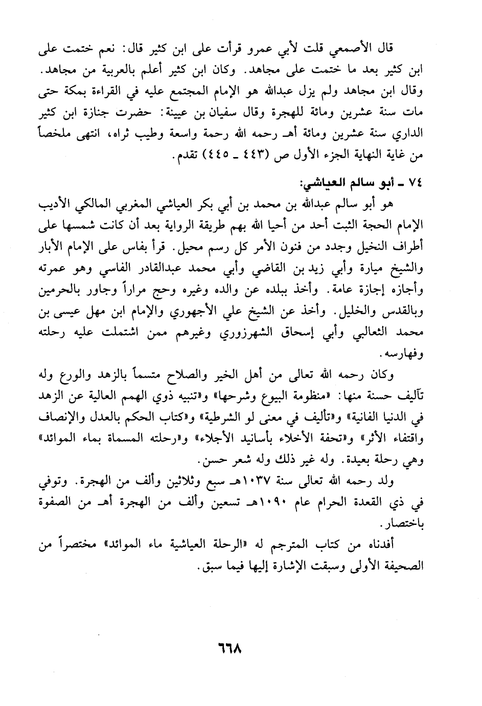 هو أبو سالم عبد الله بن محمد بن أبي بكر العياشي المغربي المالكي الأديب الإمام الحجة الثبت أحد من أحيا الله بهم طريقة الرواية بعد أن كانت شمسها على أطراف النخيل وجدد من فنون الأمر كل رسما محيل. قرأ بفاس على الإمام الأبار والشيخ ميارة وأبي زيد بن القاضي وأبي محمد عبد القادر الفاسي وهو عمرته وأجازه إجازة عامة. وأخذ ببلده عن والده وغيره وحج مراراً وجاور بالحرمين وبالقدس والخليل. وأخذ عن الشيخ علي الأجهوري والإمام ابن مهل عيسى بن محمد الثعالبي وأبي إسحاق الشهرزوري وغيرهم ممن اشتملت عليه رحلته وفهارسه.