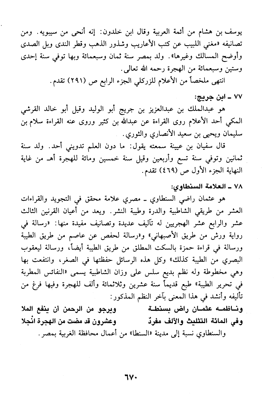 قال سفيان بن عيينة سمعته يقول: ما دون العلم تدويني أحد. ولد سنة ثمانين وتوفي سنة تسع وأربعين وقيل سنة خمسين ومائة للهجرة أهـ من غاية النهاية الجزء الأول ص (469) تقدم.