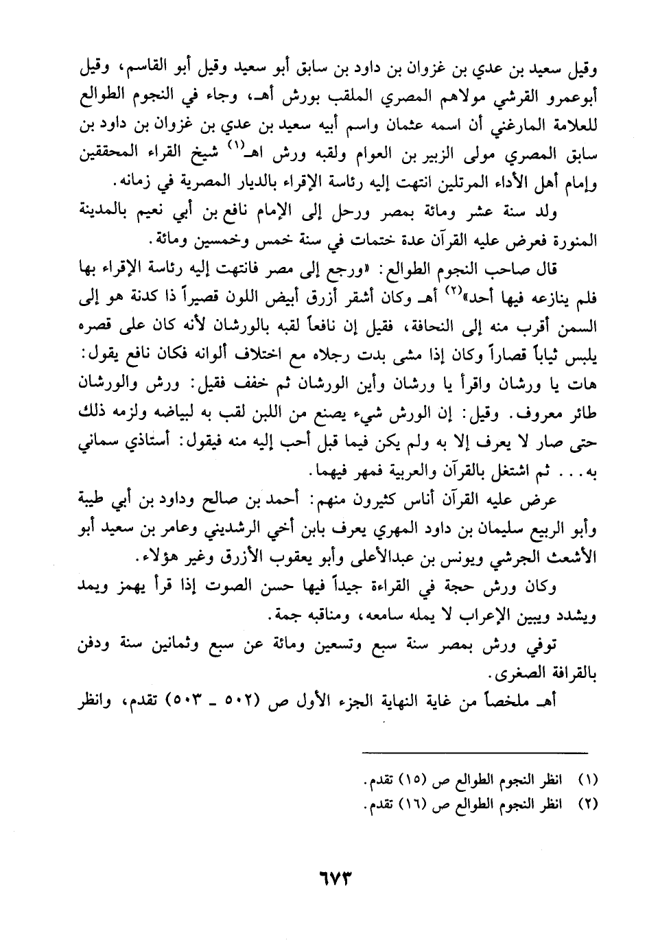 وجاء في النجوم الطوالع للعلامة المارغني أن اسمه عثمان واسم أبيه سعيد بن عدي بن غزوان بن داود بن سابق المصري مولى الزبير بن العوام ولقبه ورش اهـ شيخ القراء المحققين وإمام أهل الأداء المرتلين انتهت إليه رئاسة الإقراء بالديار المصرية في زمانه.