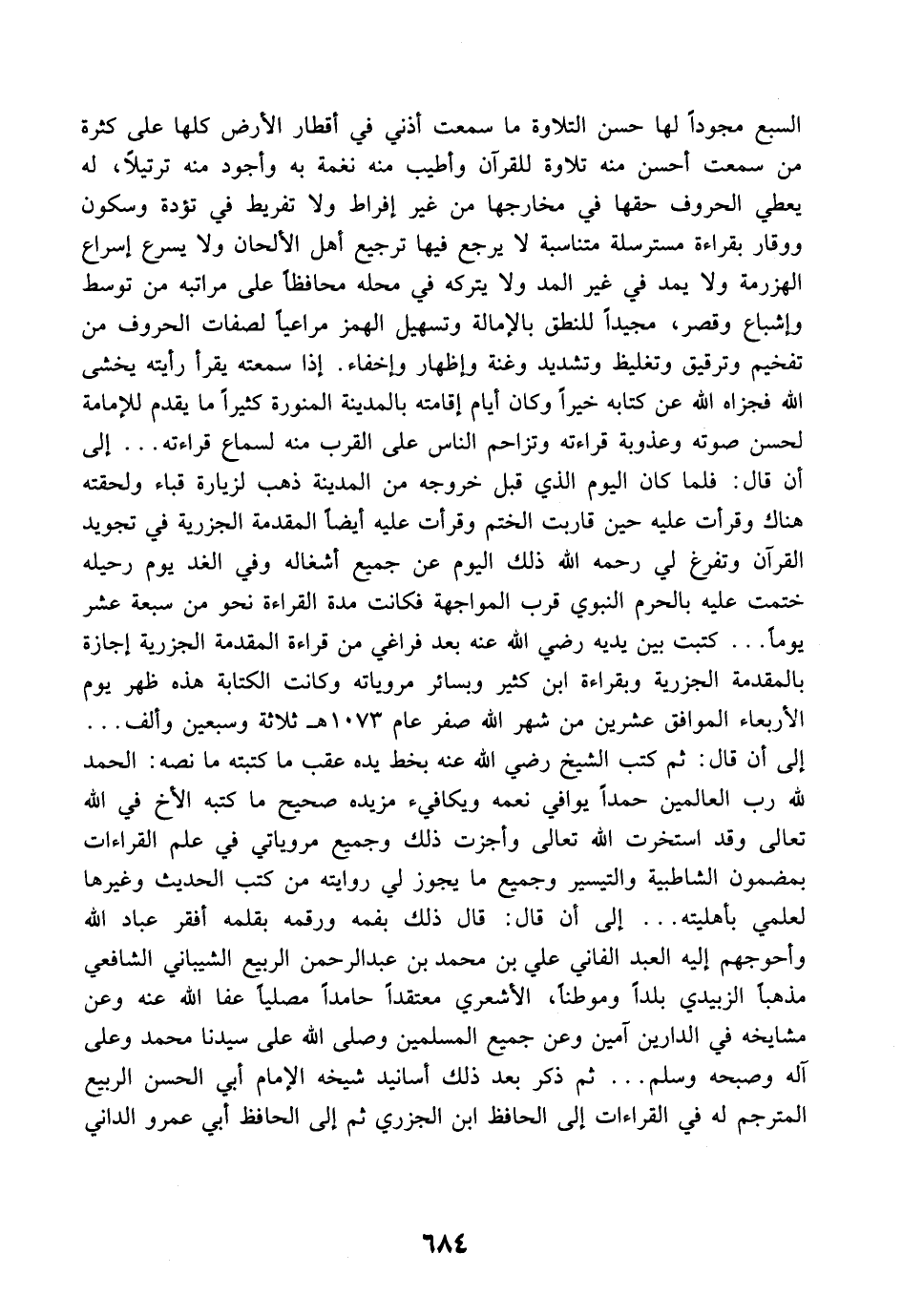 السبع مجوداً لها حسن التلاوة ما سمعت أذني في أقطار الأرض كلها على كثرة من سمعت أحسن منه تلاوة للقرآن وأطيب منه نغمة به وأجود منه ترتيلاً، له يعطي الحروف حقها في مخارجها من غير إفراط ولا تفريط في تؤدة وسكون ووقار بقراءة مسترسلة متناسبة لا يرجع فيها ترجيع أهل الألحان ولا يسرع إسراع الهزرمة ولا يمد في غير المد ولا يتركه في محله محافظاً على مراتبه من توسط وإشباع وقصر، مجيداً للنطق بالإمالة وتسهيل الهمز مراعياً لصفات الحروف من تفخيم وترقيق وتغليظ وتشديد وغنه وإظهار وإخفاء. إذا سمعته يقرأ رأيته يخشى الله فجزاه الله عن كتابه خيراً وكان أيام إقامته بالمدينة المنورة كثيراً ما يقدم للإمامة لحسن صوته وعذوبة قراءته وتزاحم الناس على القرب منه لسماع قراءته ... إلى أن قال: فلما كان اليوم الذي قبل خروجه من المدينة ذهب لزيارة قباء ولحقته هناك وقرأت عليه حين قاربت الختم وقرأت عليه أيضاً المقدمة الجزرية في تجويد القرآن وتفرغ لي رحمه الله ذلك اليوم عن جميع أشغاله وفي الغد يوم رحيله ختمت عليه بالحرم النبوي قرب المواجهة فكانت مدة القراءة نحو من سبعة عشر يوماً ... كتبت بين يديه رضي الله عنه بعد فراغي من قراءة المقدمة الجزرية إجازة بالمقدمة الجزرية وبقراءة ابن كثير وبسائر مروياته وكانت الكتابة هذه ظهر يوم الأربعاء الموافق عشرين من شهر الله صفر عام 1073هـ ثلاث وسبعين وألف ... إلى أن قال: ثم كتب الشيخ رضي الله عنه بخط يده عقب ما كتبته ما نصه: الحمد لله رب العالمين حمداً يوافي نعمه ويكافئ مزيده صحيح ما كتبه الأخ في الله تعالى وقد استخرت الله تعالى وأجزت ذلك وجميع مروياتي في علم القراءات بمضمون الشاطبية والتيسير وجميع ما يجوز لي روايته من كتب الحديث وغيرها لعلمي بأهليته ... إلى أن قال: قال ذلك بفمه ورقمه بقلمه أفقر عباد الله وأحوجهم إليه العبد الفاني علي بن محمد بن عبد الرحمن الربيع الشيباني الشافعي مذهباً الزبيدي بلداً وموطناً، الأشعري معتقداً حامداً مصلياً عفا الله عنه وعن مشايخه في الدارين آمين وعن جميع المسلمين وصلى الله على سيدنا محمد وعلى آله وصحبه وسلم ... ثم ذكر بعد ذلك أسانيد شيخه الإمام أبي الحسن الربيع المترجم له في القراءات إلى الحافظ ابن الجزري ثم إلى الحافظ أبي عمرو الداني