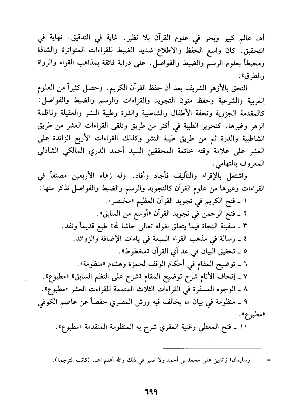 أهـ عالم كبير وبحر في علوم القرآن بلا نظير. غاية في التدقيق. نهاية في التحقيق. كان واسع الحفظ والاطلاع شديد الضبط للقراءات المتواترة والشاذة ومحيطاً بعلوم الرسم والضبط والفواصل. على دراية فائقة بمذاهب القراء والرواة والطرق".