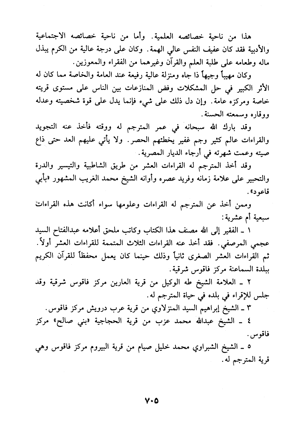 1- الفقير إلى الله مصنف هذا الكتاب وكاتب ملحق أعلامه عبد الفتاح السيد عجمي المرصفي. فقد أخذ عنه القراءات الثلاث المتممة للقراءات العشر أولاً. ثم القراءات العشر الصغرى ثانياً وذلك حينما كان يعمل محفظاً للقرآن الكريم ببلدة السماعنة مركز فاقوس شرقية.
