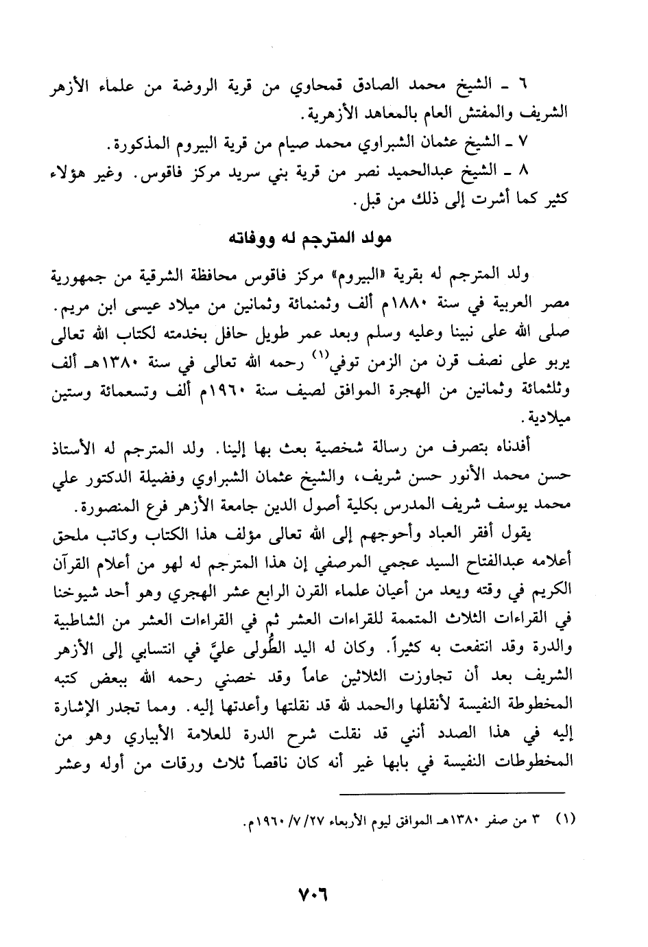 يقول أفقر العباد وأحوجهم إلى الله تعالى مؤلف هذا الكتاب وكاتب ملحق أعلامه عبد الفتاح السيد عجمي المرصفي إن هذا المترجم له لهو من أعلام القرآن الكريم في وقته ويعد من أعيان علماء القرن الرابع عشر الهجري وهو أحد شيوخنا في القراءات الثلاث المتممة للقراءات العشر ثم في القراءات العشر من الشاطبية والدرة وقد انتفعت به كثيراً. وكان له اليد الطُّولى عليَّ في انتسابي إلى الأزهر الشريف بعد أن تجاوزت الثلاثين عاماً وقد خصني رحمه الله ببعض كتبه المخطوطة النفيسة لأنقلها والحمد لله قد نقلتها وأعدتها إليه. ومما تجدر الإشارة إليه في هذا الصدد أنني قد نقلت شرح الدرة للعلامة الأبياري وهو من المخطوطات النفيسة في بابها غير أنه كان ناقصاً ثلاث ورقات من أوله وعشر