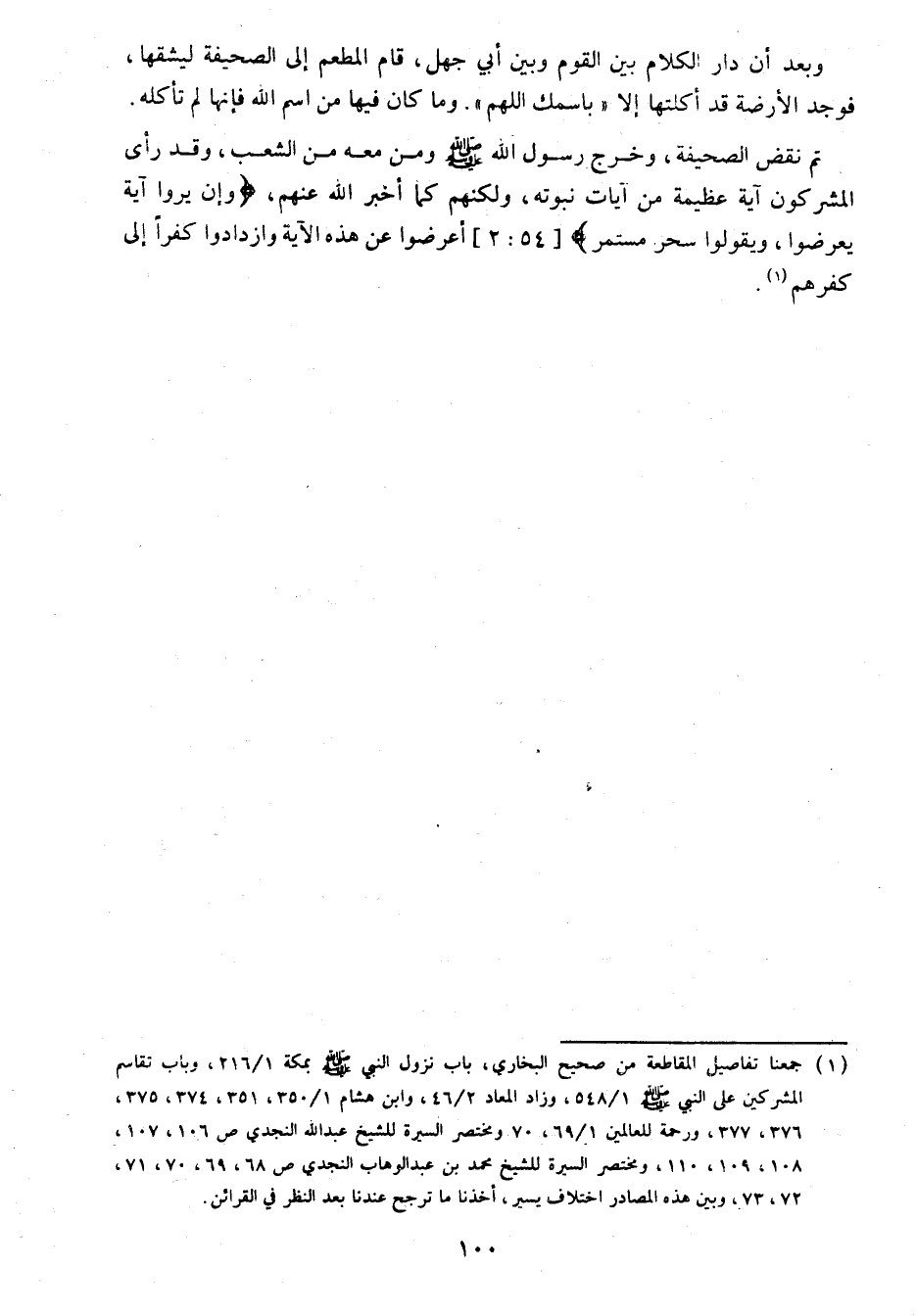 (1) جمعنا تفاصيل المقاطعة من صحيح البخاري، باب نزول النبي صلى الله عليه وسلم بمكة 1/ 216، وباب تقاسم المشركين على النبي صلى الله عليه وسلم 1/ 548، وزاد المعاد 2/ 46، وابن هشام 1/ 350، 351، 374، 375، 376، 377، ورحمة للعالمين 1/ 69، 70 ومختصر السيرة للشيخ عبد الله النجدي ص 106، 107، 108، 109، 110، ومختصر السيرة للشيخ محمد بن عبد الوهاب النجدي ص 68، 69، 70، 71، 72، 73، وبين هذه المصادر اختلاف يسير، أخذنا ما ترجح عندنا بعد النظر في القرائن.