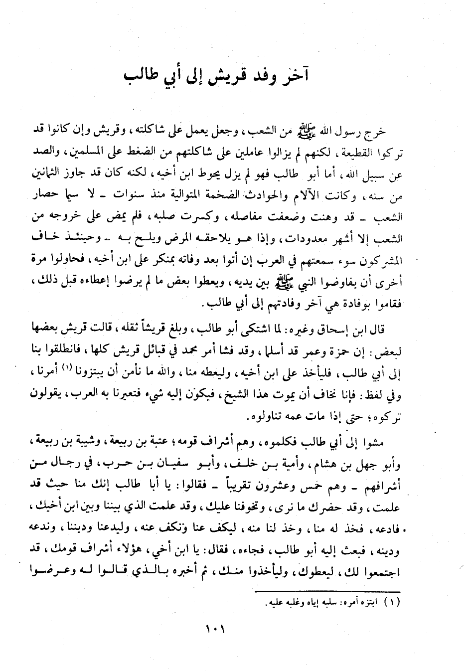مشوا إلى أبي طالب فكلموه، وهم أشراف قومه؛ عتبة بن ربيعة، وشيبة بن ربيعة، وأبو جهل بن هشام، وأمية بن خلف، وأبو سفيان بن حرب، في رجال من أشرافهم- وهم خمس وعشرون تقريبا- فقالوا: يا أبا طالب إنك منا حيث قد علمت، وقد حضرك ما نرى، وتخوفنا عليك وقد علمت الذين بيننا وبين ابن أخيك، فادعه، فخذ له منا، وخذ لنا منه، ليكف عنا ونكف عنه، وليدعنا وديننا، وندعه ودينه، فبعث إليه أبو طالب، فجاءه، فقال: يا ابن أخي، هؤلاء أشراف قومك، قد اجتمعوا لك، ليعطوك، وليأخذوا منك، ثم أخبره