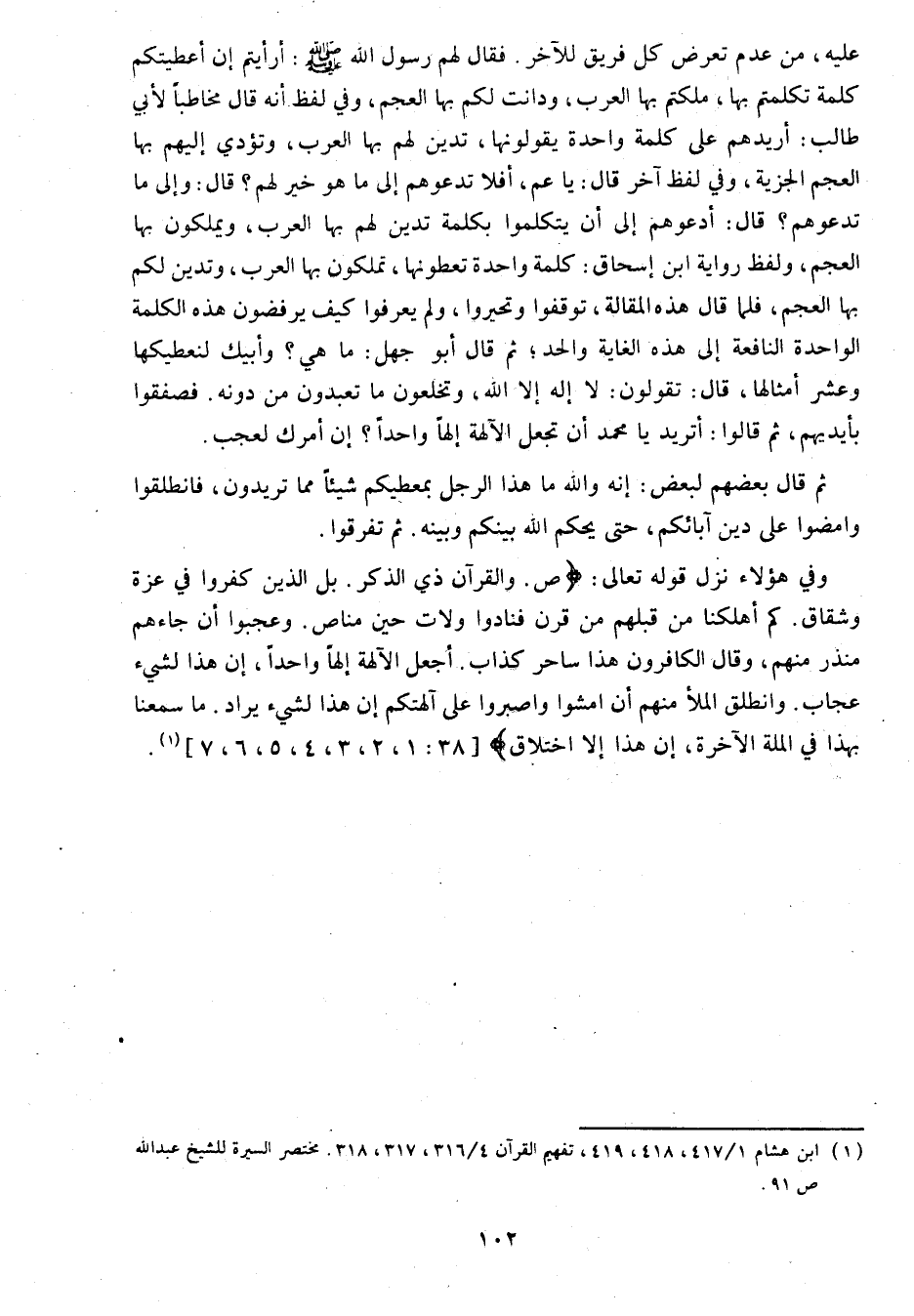 وفي هؤلاء نزل قوله تعالى: ص. وَالْقُرْآنِ ذِي الذِّكْرِ. بَلِ الَّذِينَ كَفَرُوا فِي عِزَّةٍ وَشِقاقٍ. كَمْ أَهْلَكْنا مِنْ قَبْلِهِمْ مِنْ قَرْنٍ فَنادَوْا وَلاتَ حِينَ مَناصٍ. وَعَجِبُوا أَنْ جاءَهُمْ مُنْذِرٌ مِنْهُمْ، وَقالَ الْكافِرُونَ هذا ساحِرٌ كَذَّابٌ، أَجَعَلَ الْآلِهَةَ إِلهاً واحِداً، إِنَّ هذا لَشَيْءٌ عُجابٌ.