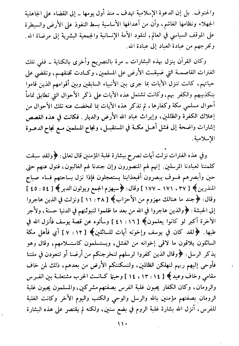 13، 14] وحينما كانت الحرب مشتعلة بين الفرس والرومان، وكان الكفار يحبون غلبة الفرس بصفتهم مشركين، والمسلمون يحبون غلبة الرومان بصفتهم مؤمنين بالله والرسل والوحي والكتب واليوم الآخر وكانت الغلبة للفرس، أنزل الله بشارة غلبة الروم في بضع سنين، ولكنه لم يقتصر على هذه البشارة الواحدة، بل صرح ببشارة أخرى وهي نصر الله للمؤمنين حيث قال: وَيَوْمَئِذٍ يَفْرَحُ الْمُؤْمِنُونَ بِنَصْرِ اللَّهِ [الروم: 4، 5] .