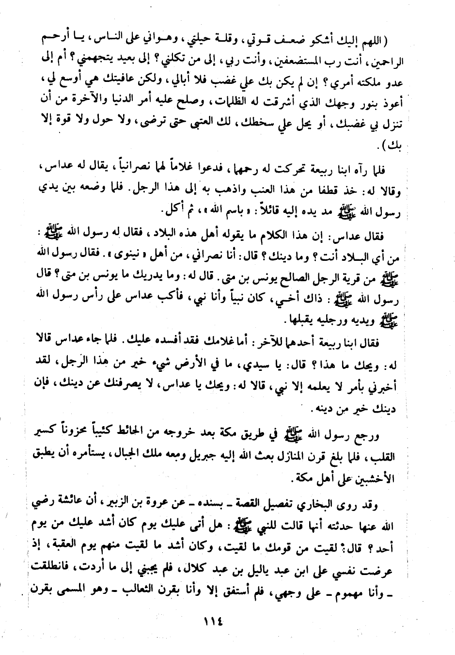 «من قرية الرجل الصالح يونس بن متى!» قال له: وما يدريك ما يونس بن متى؟ قال رسول الله صلى الله عليه وسلم: «ذاك أخي، كان نبيا وأنا نبي» ، فأكب عداس على رأس رسول الله صلى الله عليه وسلم ويديه ورجليه يقبلها.