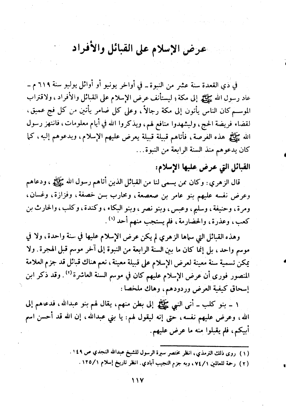 ولا يمكن تسمية سنة معينة لعرض الإسلام على قبيلة معينة، نعم هناك قبائل قد جزم العلامة المنصور فوري أن عرض الإسلام عليهم كان في موسم السنة العاشرة «2» . وقد ذكر ابن إسحاق كيفية العرض وردودهم، وهاك ملخصا: