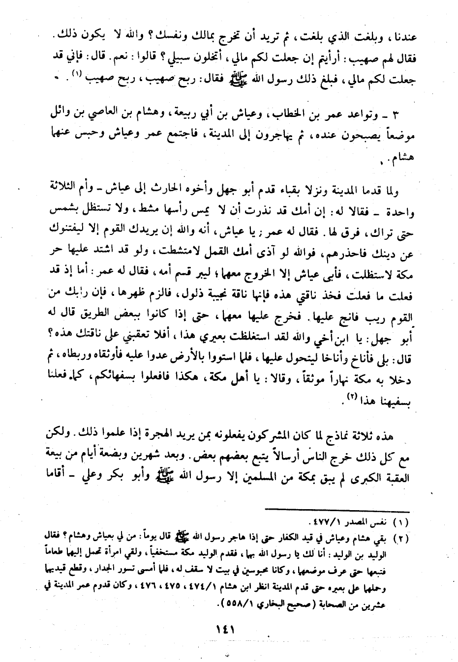 (2) بقي هشام وعياش في قيد الكفار حتى إذا هاجر رسول الله صلى الله عليه وسلم قال يوما: من لي بعياش وهشام؟ فقال الوليد بن الوليد: أنا لك يا رسول الله بهما، فقدم الوليد مكة مستخفيا، ولقي امرأة تحمل إليهما طعاما فتبعها حتى عرف موضعهما، وكانا محبوسين في بيت لا سقف له، فلما أمسى تسور الجدار، وقطع قيديهما وحملهما على بعيره حتى قدم المدينة انظر ابن هشام 1/ 474، 475، 476، وكان قدوم عمر المدينة في عشرين من الصحابة (صحيح البخاري 1/ 558) .