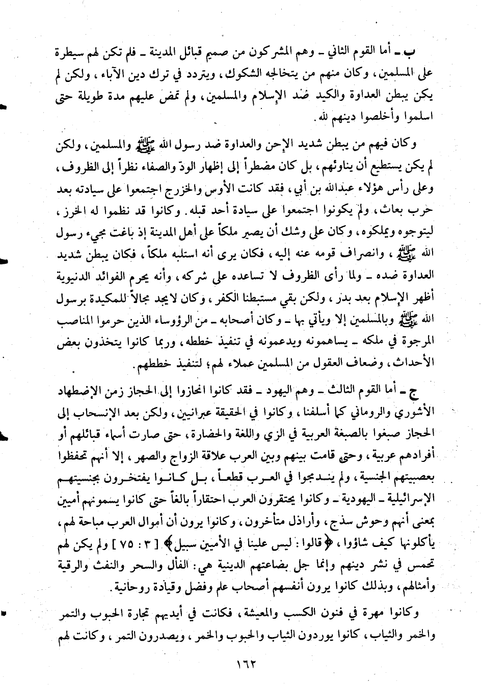 ب- أما القوم الثاني- وهم المشركون من صميم قبائل المدينة- فلم تكن لهم سيطرة على المسلمين، وكان منهم من يتخالجه الشكوك، ويتردد في ترك دين الآباء، ولكن لم يكن يبطن العداوة والكيد ضد الإسلام والمسلمين، ولم تمض عليهم مدة طويلة حتى أسلموا وأخلصوا دينهم لله.