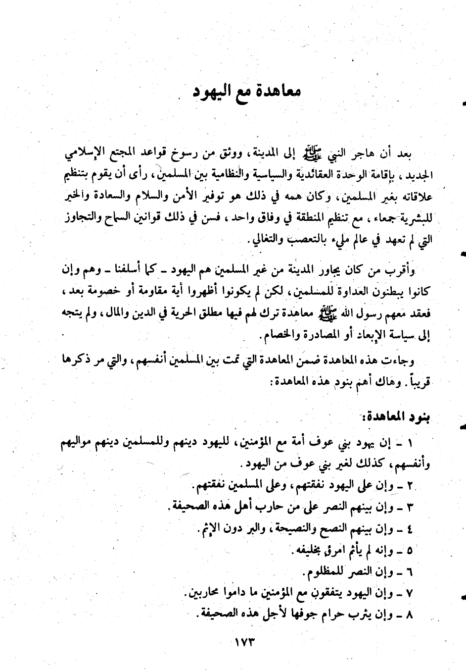 وأقرب من كان يجاور المدينة من غير المسلمين هم اليهود- كما أسلفنا- وهم وإن كانوا يبطنون العداوة للمسلمين، لكن لم يكونوا أظهروا أية مقاومة أو خصومة بعد، فعقد معهم رسول الله صلى الله عليه وسلم معاهدة ترك لهم فيها مطلق الحرية في الدين والمال، ولم يتجه إلى سياسة الإبعاد أو المصادرة والخصام.