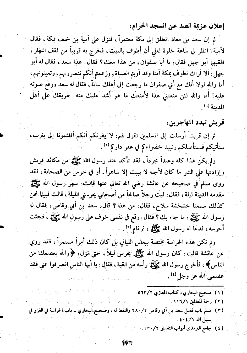 ولم يكن هذا كله وعيدا مجردا، فقد تأكد عند رسول الله صلى الله عليه وسلم من مكيد قريش وإرادتها على الشر ما كان لأجله لا يبيت إلا ساهرا، أو في حرس من الصحابة، فقد روى مسلم في صحيحه عن عائشة رضي الله تعالى عنها قالت: سهر رسول الله صلى الله عليه وسلم مقدمة المدينة ليلة، فقال: ليت رجلا صالحا من أصحابي يحرسني الليلة، قالت: فبينما نحن كذلك سمعنا خشخشة سلاح، فقال: من هذا؟ قال: سعد بن أبي وقاص، فقال له رسول الله صلى الله عليه وسلم: ما جاء بك؟ فقال: وقع في نفسي خوف على رسول الله صلى الله عليه وسلم، فجئت أحرسه، فدعا له رسول الله صلى الله عليه وسلم، ثم نام «3» .