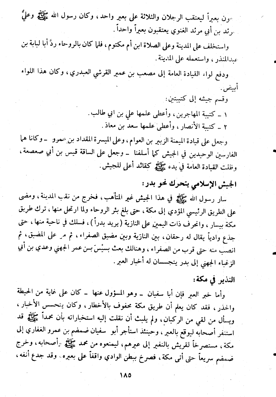 وجعل على قيادة الميمنة الزبير بن العوام، وعلى الميسرة المقداد بن عمرو- وكانا هما الفارسين الوحيدين في الجيش كما أسلفنا- وجعل على الساقة قيس بن أبي صعصعة، وظلت القيادة العامة في يده صلى الله عليه وسلم كقائد أعلى للجيش.
