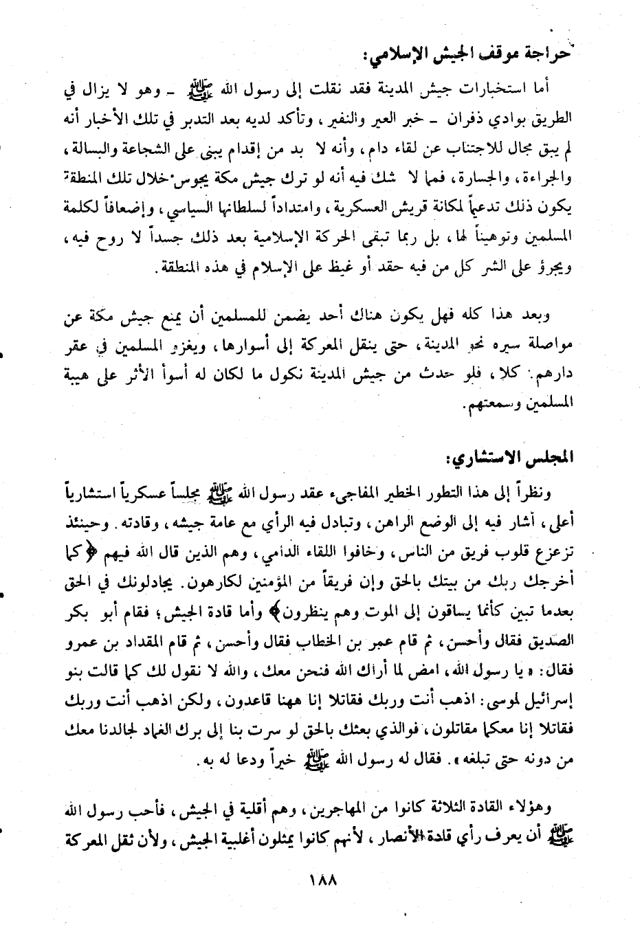 أما استخبارات جيش المدينة فقد نقلت إلى رسول الله صلى الله عليه وسلم- وهو لا يزال في الطريق بوادي ذفران- خبر العير والنفير، وتأكد لديه بعد التدبر في تلك الأخبار أنه لم يبق مجال للإجتناب عن لقاء دام، وأنه لا بد من إقدام يا بنى على الشجاعة والبسالة، والجراءة، والجسارة، فمما لا شك فيه أنه لو ترك جيش مكة يجوس خلال تلك المنطقة يكون ذلك تدعيما لمكانة قريش العسكرية، وامتدادا لسلطانها السياسي، وإضعافا لكلمة المسلمين وتوهينا لها، بل ربما تبقى الحركة الإسلامية بعد ذلك جسدا لا روح فيه، ويجرؤ على الشر كل من فيه حقد أو غيظ على الإسلام في هذه المنطقة.