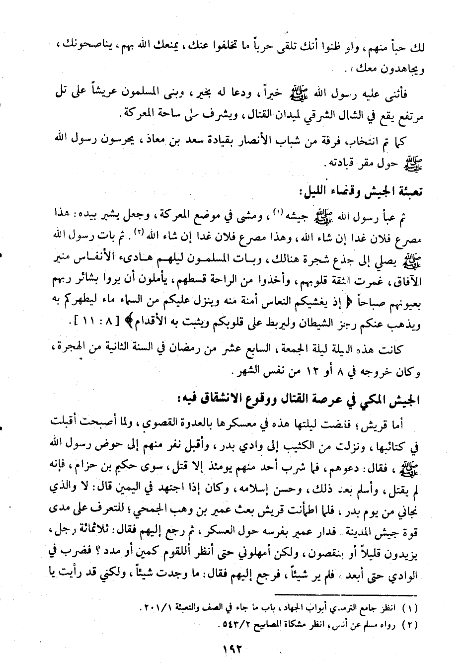 ثم عبأ رسول الله صلى الله عليه وسلم جيشه «1» ، ومشى في موضع المعركة، وجعل يشير بيده: هذا مصرع فلان غدا إن شاء الله، وهذا مصرع فلان غدا إن شاء الله «2» . ثم بات رسول الله صلى الله عليه وسلم يصلي إلى جذع شجرة هنالك، وبات المسلمون ليلهم هادئ الأنفاس منير الآفاق، غمرت الثقة قلوبهم، وأخذوا من الراحة قسطهم، يأملون أن يروا بشائر ربهم بعيونهم صباحا إِذْ يُغَشِّيكُمُ النُّعاسَ أَمَنَةً مِنْهُ وَيُنَزِّلُ عَلَيْكُمْ مِنَ السَّماءِ ماءً لِيُطَهِّرَكُمْ بِهِ وَيُذْهِبَ عَنْكُمْ رِجْزَ الشَّيْطانِ وَلِيَرْبِطَ عَلى قُلُوبِكُمْ وَيُثَبِّتَ بِهِ الْأَقْدامَ [الأنفال: 11] .