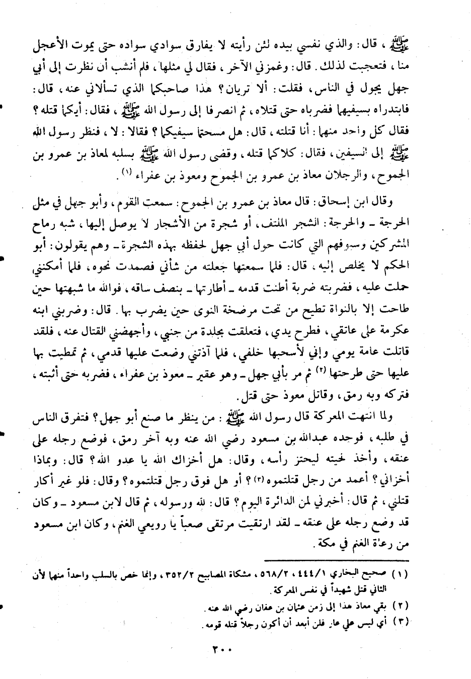 يا عم، أرني أبا جهل، فقلت: يا ابن أخي، فما تصنع به؟ قال: أخبرت أنه يسب رسول الله صلى الله عليه وسلم، قال: والذي نفسي بيده لئن رأيته لا يفارق سوادي سواده حتى يموت الأعجل منا، فتعجبت لذلك. قال: وغمزني الآخر، فقال لي مثلها، فلم أنشب أن نظرت إلى أبي جهل يجول في الناس، فقلت: ألا تريان؟ هذا صاحبكما الذي تسألاني عنه، قال: فابتدراه بسيفيهما فضرباه حتى قتلاه، ثم انصرفا إلى رسول الله صلى الله عليه وسلم، فقال: أيكما قتله؟ فقال كل واحد منهما: أنا قتلته، قال: هل مسحتما سيفيكما؟ فقالا: لا، فنظر رسول الله صلى الله عليه وسلم إلى السيفين، فقال: كلاكما قتله، وقضى رسول الله صلى الله عليه وسلم بسلبه لمعاذ بن عمرو بن الجموح، والرجلان معاذ بن عمرو بن الجموح ومعوذ بن عفراء «1» .
