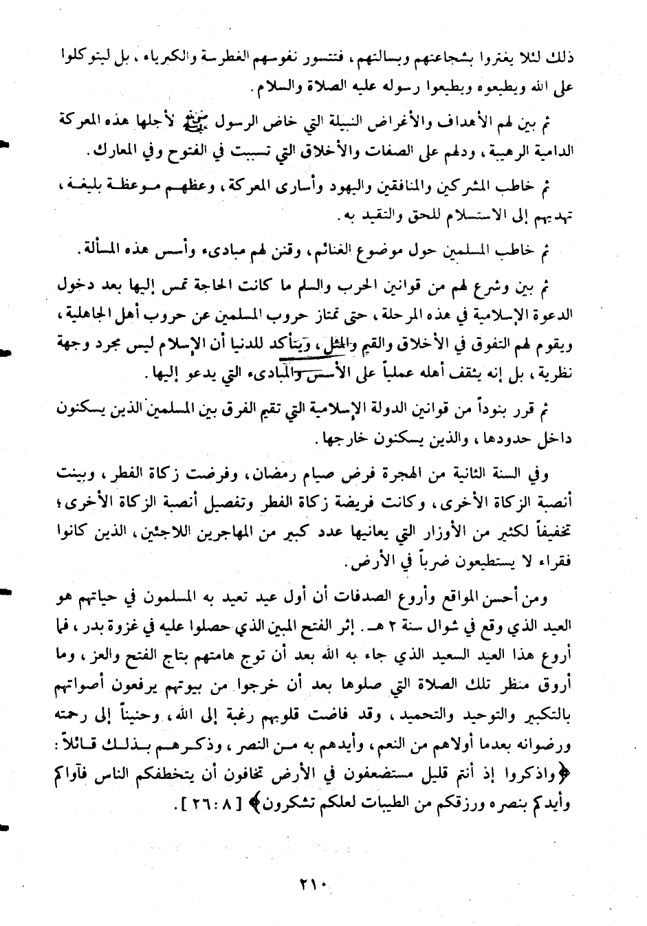 ثم بين وشرع لهم من قوانين الحرب والسلم ما كانت الحاجة تمس إليها بعد دخول الدعوة الإسلامية في هذه المرحلة، حتى تمتاز حروب المسلمين عن حروب أهل الجاهلية، ويقوم لهم التفوق في الأخلاق والقيم والمثل، ويتأكد للدنيا أن الإسلام ليس مجرد وجهة نظرية، بل إنه يثقف أهله عمليا على الأسس والمبادئ التي يدعو إليها.