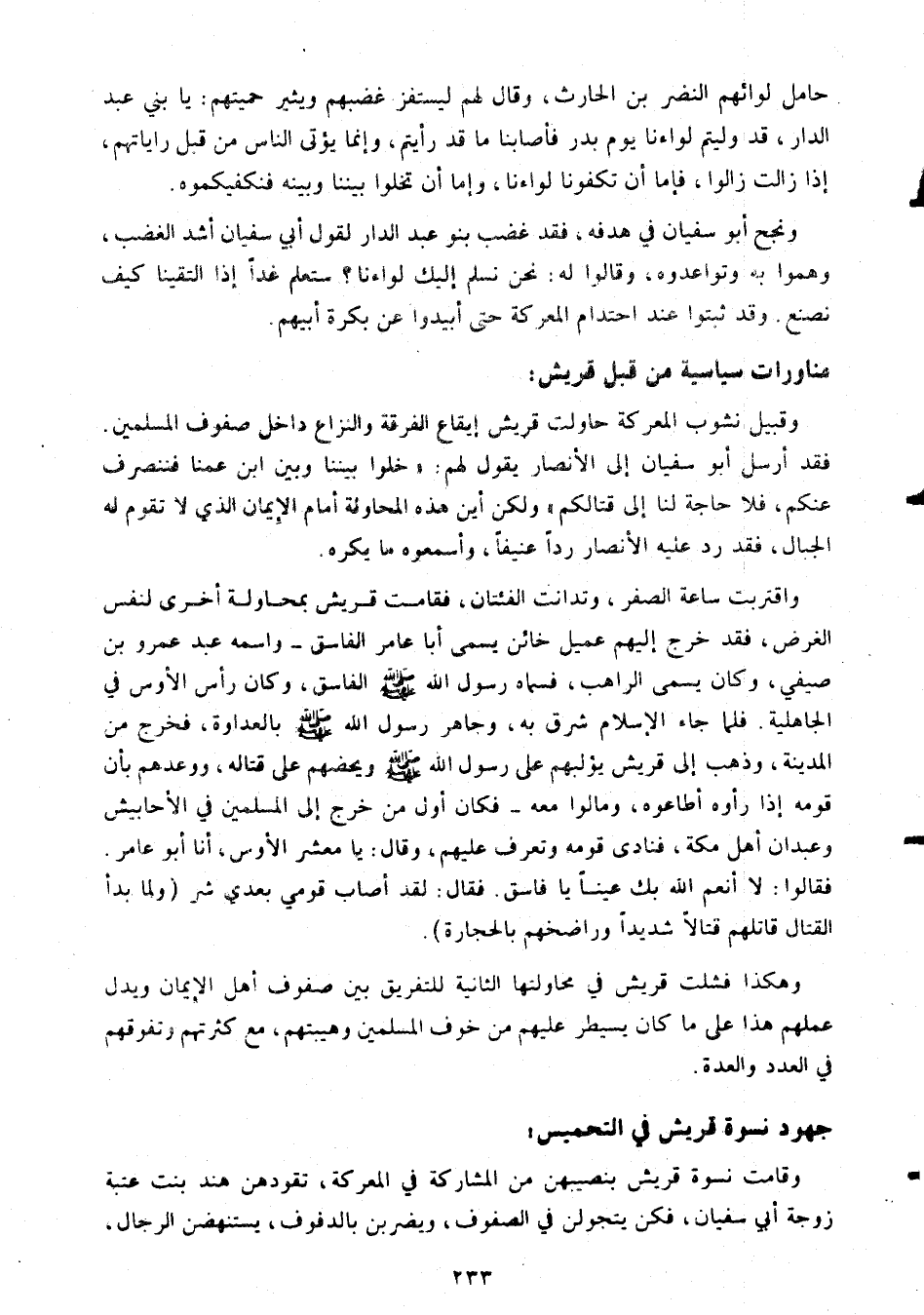 النضر بن الحارث، وقال لهم ليستفز غضبهم ويثير حميتهم: يا بني عبد الدار، قد وليتم لواءنا يوم بدر فأصابنا ما قد رأيتم، وإنما يؤتى الناس من قبل راياتهم، إذا زالت زالوا، فإما أن تكفونا لواءنا، وإما أن تخلوا بيننا وبينه فنكفيكموه.