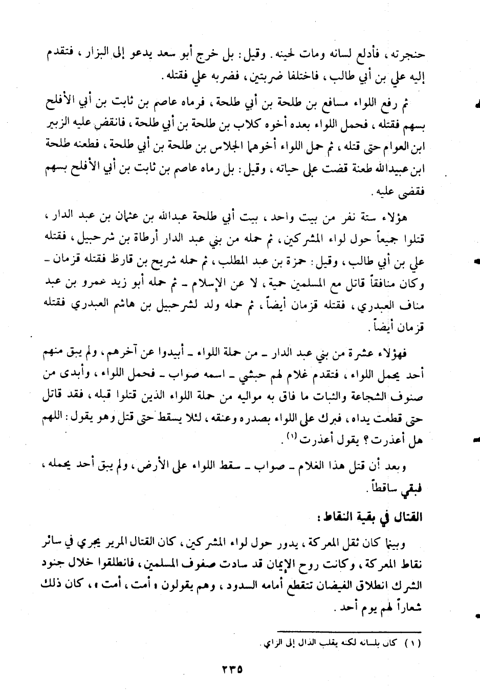 فهؤلاء عشرة من بني عبد الدار- من حملة اللواء- أبيدوا عن آخرهم، ولم يبق منهم أحد يحمل اللواء، فتقدم غلام لهم حبشي- اسمه صواب- فحمل اللواء، وأبدى من صنوف الشجاعة والثبات ما فاق به مواليه من حملة اللواء الذين قتلوا قبله، فقد قاتل حتى قطعت يداه، فبرك على اللواء بصدره وعنقه، لئلا يسقط حتى قتل وهو يقول: اللهم هل أعذرت؟ يقول أعذرت «1» .