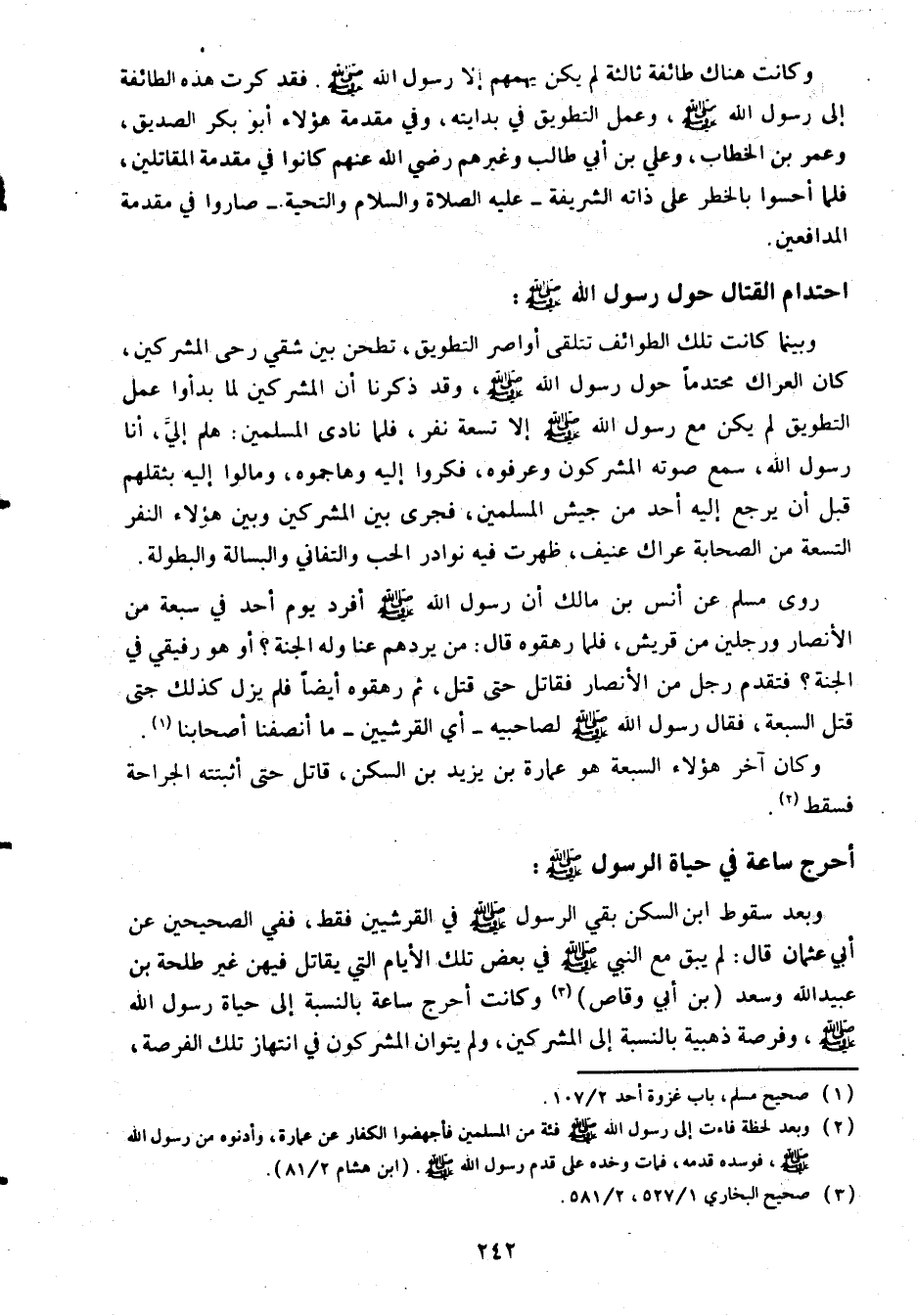 وكانت هناك طائفة ثالثة لم يكن يهمهم إلا رسول الله صلى الله عليه وسلم. فقد كرت هذه الطائفة إلى رسول الله صلى الله عليه وسلم، وعمل التطويق في بدايته، وفي مقدمة هؤلاء أبو بكر الصديق، وعمر بن الخطاب، وعلي بن أبي طالب، وغيرهم رضي الله عنهم كانوا في مقدمة المقاتلين، فلما أحسوا بالخطر على ذاته الشريفة- عليه الصلاة والسلام والتحية- صاروا في مقدمة المدافعين.