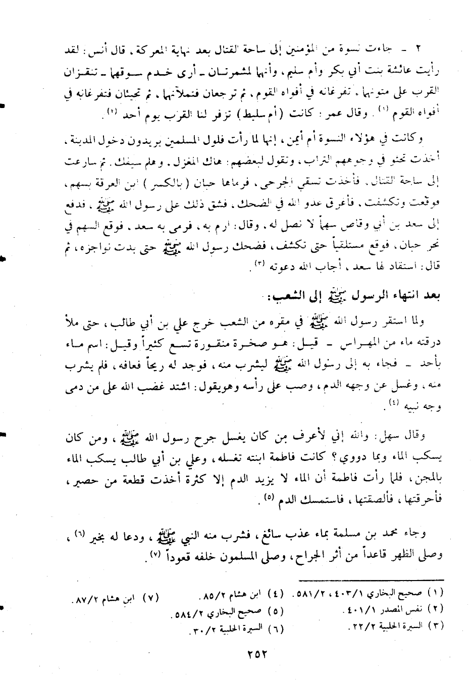 2- جاءت نسوة من المؤمنين إلى ساحة القتال بعد نهاية المعركة، قال أنس: لقد رأيت عائشة بنت أبي بكر وأم سليم، وأنهما لمشمرتان- أرى خدم سوقهما- تنقزان القرب على متونهما، تفرغانه في أفواه القوم، ثم ترجعان فتملآنهما، ثم تجيئان فتفرغانه في أفواه القوم «1» . وقال عمر: كانت (أم سليط) تزفر لنا القرب يوم أحد «2» .