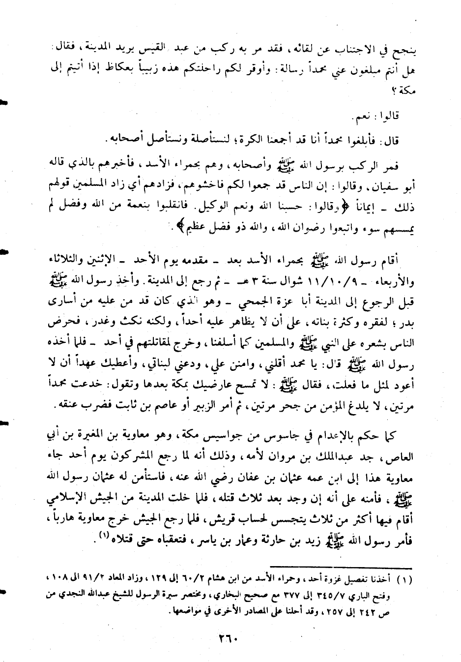 (1) أخذنا تفصيل غزوة أحد، وحمراء الأسد من ابن هشام 2/ 60 إلى 129، وزاد المعاد 2/ 91 إلى 108، وفتح الباري 7/ 345 إلى 377 مع صحيح البخاري، ومختصر سيرة الرسول للشيخ عبد الله النجدي من ص 242 إلى 257، وقد أحلنا على المصادر الآخرى في مواضعها.