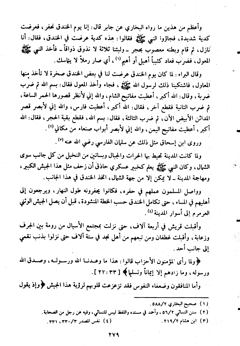 وواصل المسلمون عملهم في حفره، فكانوا يحفرونه طول النهار، ويرجعون إلى أهليهم في المساء، حتى تكامل الخندق حسب الخطة المنشودة، قبل أن يصل الجيش الوثني العرمرم إلى أسوار المدينة «4» .