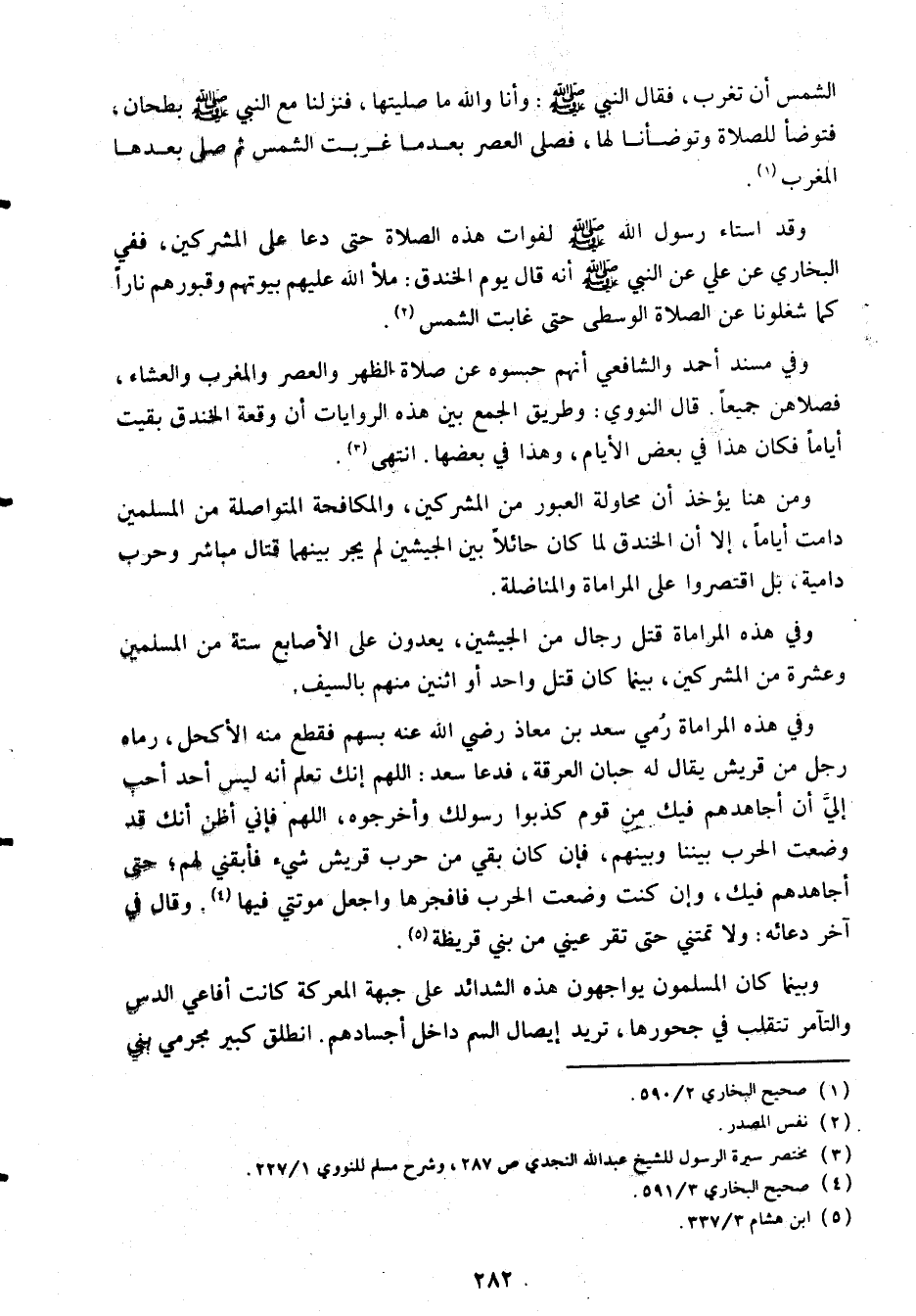 وفي مسند أحمد والشافعي أنهم حبسوه عن صلاة الظهر والعصر والمغرب والعشاء، فصلاهن جميعا. قال النووي: وطريق الجمع بين هذه الروايات أن وقعة الخندق بقيت أياما فكان هذا في بعض الأيام، وهذا في بعضها. انتهى «3» .