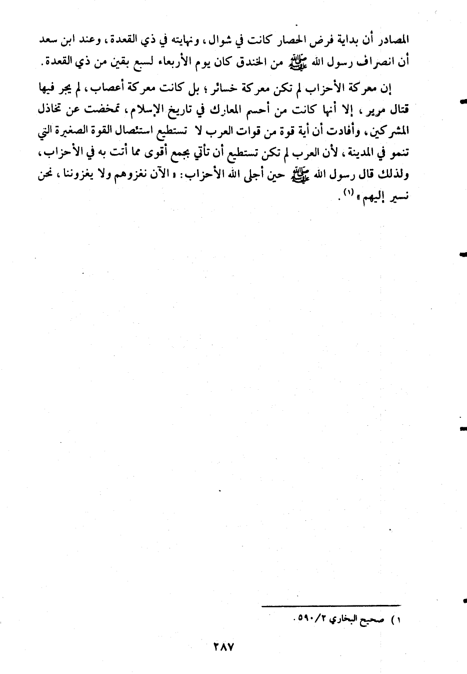إن معركة الأحزاب لم تكن معركة خسائر؛ بل كانت معركة أعصاب، لم يجر فيها قتال مرير، إلا أنها كانت من أحسم المعارك في تاريخ الإسلام، تمخضت عن تخاذل المشركين، وأفادت أن أية قوة من قوات العرب لا تستطيع إستئصال القوة الصغيرة التي تنمو في المدينة، لأن العرب لم تكن تستطيع أن تأتي بجمع أقوى مما أتت به في الأحزاب، ولذلك قال رسول الله صلى الله عليه وسلم حين أجلى الله الأحزاب: «الآن نغزوهم ولا يغزوننا، نحن نسير إليهم» «1» .