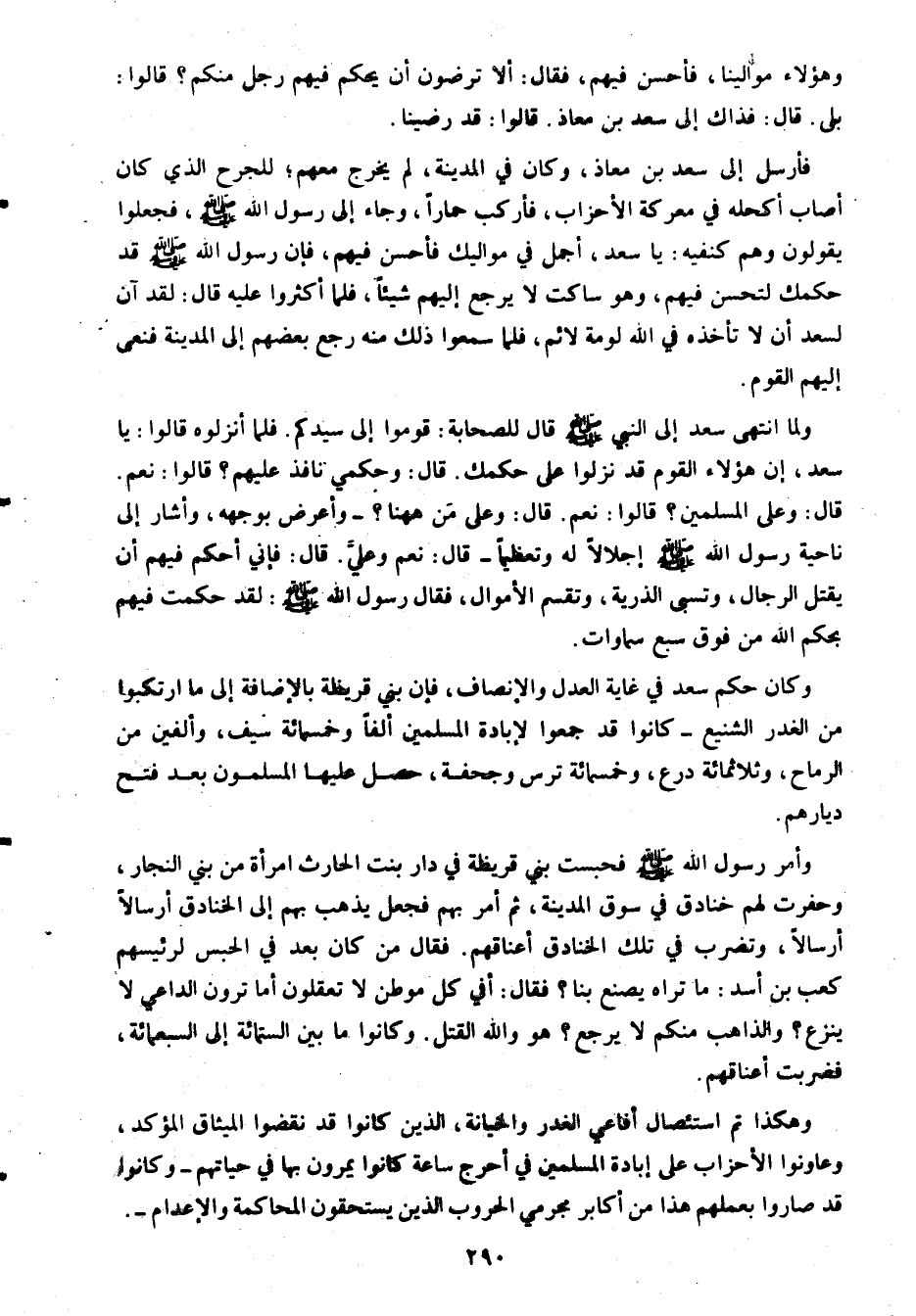 فأرسل إلى سعد بن معاذ، وكان في المدينة، لم يخرج معهم؛ للجرح الذي كان أصاب أكحله في معركة الأحزاب، فأركب حمارا، وجاء إلى رسول الله صلى الله عليه وسلم، فجعلوا يقولون وهم كنفيه: يا سعد، أجمل في مواليك فأحسن فيهم، فإن رسول الله صلى الله عليه وسلم قد حكمك لتحسن فيهم، وهو ساكت لا يرجع إليهم شيئا، فلما أكثروا عليه قال: لقد آن لسعد ألاتأخذه في الله لومة لائم، فلما سمعوا ذلك منه رجع بعضهم إلى المدينة فنعى إليهم القوم.