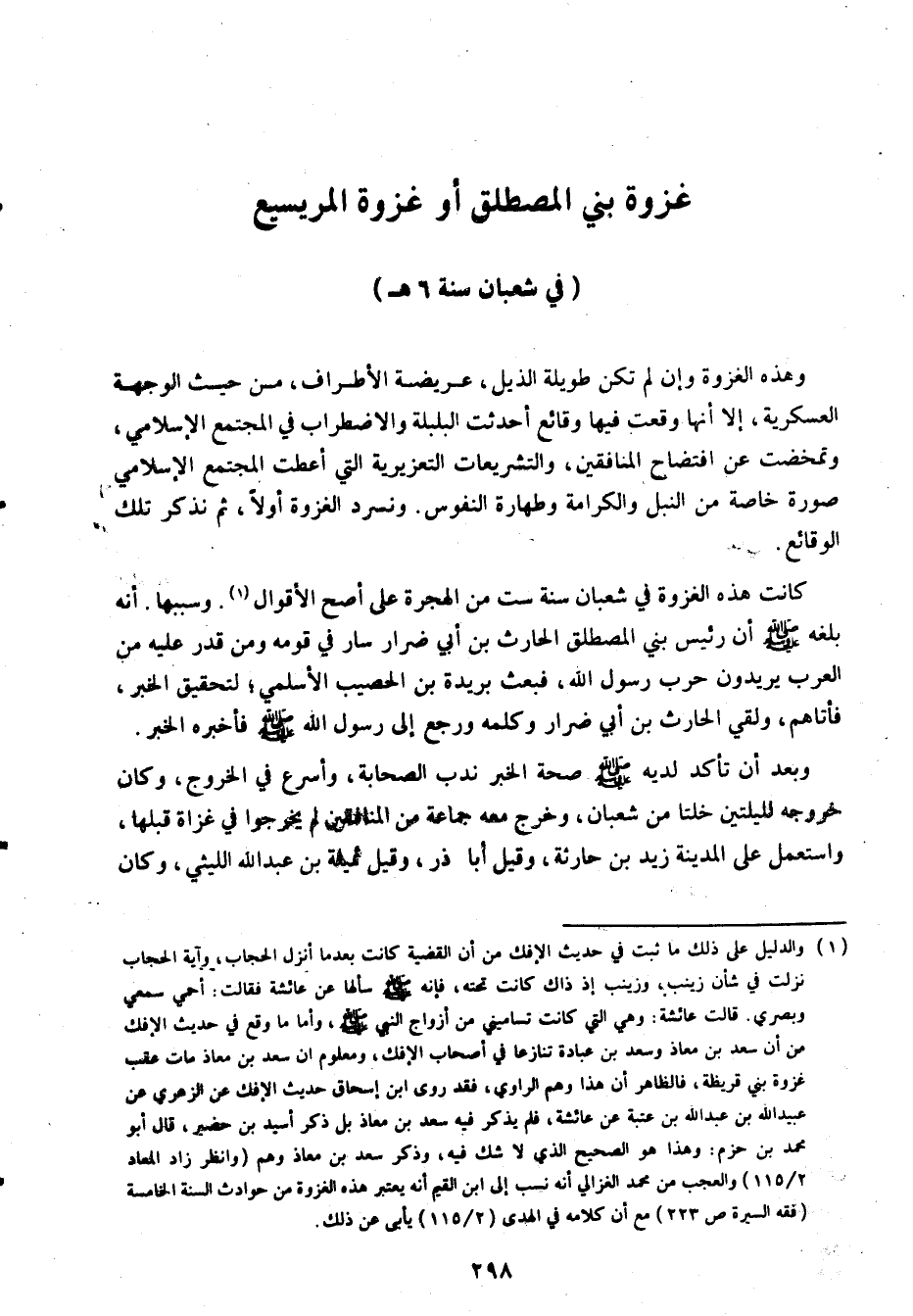(1) والدليل على ذلك ما ثبت في حديث الإفك من أن القضية كانت بعد ما أنزل الحجاب، وآية الحجاب نزلت في شأن زينب، وزينب إذ ذاك كانت تحته، فإنه صلى الله عليه وسلم سألها عن عائشة فقالت: أحمي سمعي وبصري. قالت عائشة: وهي التي كانت تساميني من أزواج النبيّ صلى الله عليه وسلم، وأما ما وقع في حديث الإفك من أن سعد بن معاذ وسعد بن عبادة تنازعا في أصحاب الإفك، ومعلوم أن سعد بن معاذ مات عقب غزوة بني قريظة، فالظاهر أن هذا وهم الراوي، فقد روى ابن إسحاق حديث الإفك عن الزهري عن عبيد الله بن عبد الله بن عتبة عن عائشة، فلم يذكر فيه سعد بن معاذ بل ذكر أسيد بن حضير، قال أبو محمد بن حزم: وهذا هو الصحيح الذي لا شك فيه، وذكر سعد بن معاذ وهم (وانظر زاد المعاد 2/ 115) والعجب من محمد الغزالي أنه نسب إلى ابن القيم أنه يعتبر هذه الغزوة من حوادث السنة الخامسة (فقه السيرة ص 223) مع أن كلامه في الهدى (2/ 115) يأبى عن ذلك.