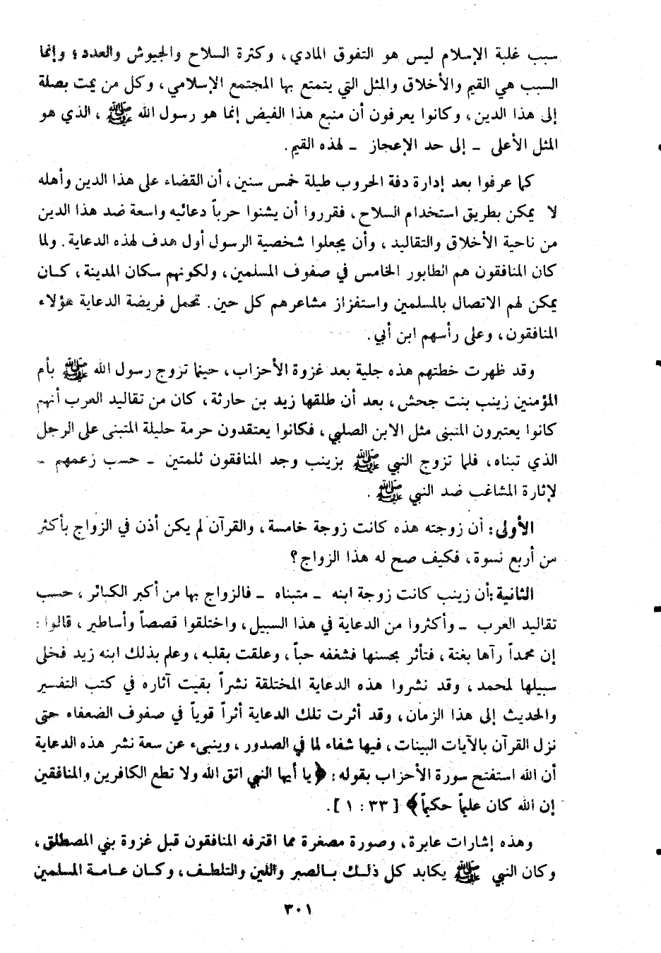 الثانية: أن زينب كانت زوجة ابنه- متبناه- فالزواج بها من أكبر الكبائر، حسب تقاليد العرب- وأكثروا من الدعاية في هذا السبيل، واختلقوا قصصا وأساطير، قالوا: إن محمدا رآها بغتة، فتأثر بحسنها فشغفه حبا، وعلقت بقلبه، وعلم بذلك ابنه زيد فخلى سبيلها لمحمد، وقد نشروا هذه الدعاية المختلقة نشرا بقيت آثاره في كتب التفسير والحديث إلى هذا الزمان، وقد أثرت تلك الدعاية أثرا قويا في صفوف الضعفاء حتى نزل القرآن بالآيات البينات، فيها شفاء لما في الصدور، وينبئ عن سعة نشر هذه الدعاية أن الله استفتح سورة الأحزاب بقوله: يا أَيُّهَا النَّبِيُّ اتَّقِ اللَّهَ وَلا تُطِعِ الْكافِرِينَ وَالْمُنافِقِينَ إِنَّ اللَّهَ كانَ عَلِيماً حَكِيماً [الأحزاب: 1] .