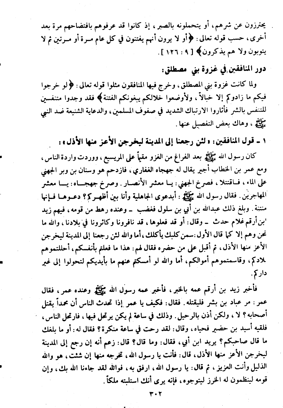 فأخبر زيد بن أرقم عمه بالخبر، فأخبر عمه رسول الله صلى الله عليه وسلم وعنده عمر، فقال عمر: مر عباد بن بشر فليقتله. فقال: «فكيف يا عمر إذا تحدث الناس أن محمدا يقتل أصحابه؟ لا، ولكن أذّن بالرحيل» . وذلك في ساعة لم يكن يرتحل فيها، فارتحل الناس، فلقيه أسيد بن حضير فحياه، وقال: لقد رحت في ساعة منكرة؟ فقال له: «أو ما بلغك ما قال صاحبكم؟» يريد ابن أبي، فقال: وما قال؟ قال: زعم أنه إن رجع إلى المدينة ليخرجن الأعز منها الأذل، قال: فأنت يا رسول الله، تخرجه منها إن شئت، هو والله لذليل وأنت العزيز، ثم قال: يا رسول الله، ارفق به، فو الله لقد جاءنا الله بك، وإن قومه لينظمون له الخرز ليتوجوه، فإنه يرى أنك استلبته ملكا.