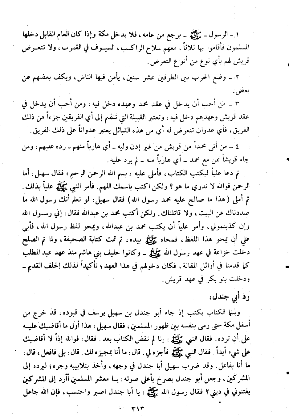وبينما الكتاب يكتب إذ جاء أبو جندل بن سهيل يرسف في قيوده، قد خرج من أسفل مكة حتى رمى بنفسه بين ظهور المسلمين، فقال سهيل: هذا أول ما أقاضيك عليه على أن ترده. فقال النبيّ صلى الله عليه وسلم: إنا لم نقض الكتاب بعد. فقال: فو الله إذا لا أقاضيك على شيء أبدا. فقال النبيّ صلى الله عليه وسلم: فأجزه لي. قال: ما أنا بمجيزه لك. قال: بلى فافعل، قال: ما أنا بفاعل. وقد ضرب سهيل أبا جندل في وجهه، وأخذ بتلابيبه وجره، ليرده إلى المشركين، وجعل أبو جندل يصرخ بأعلى صوته: يا معشر المسلمين أأرد إلى المشركين يفتنوني في ديني؟ فقال رسول الله صلى الله عليه وسلم: «يا أبا جندل أصبر واحتسب، فإن الله جاعل لك ولمن معك من
