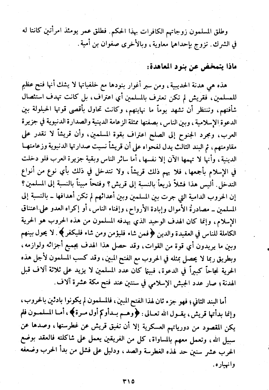 أما البند الثاني؛ فهو جزء ثان لهذا الفتح المبين، فالمسلمون لم يكونوا بادئين بالحروب، وإنما بدأتها قريش، يقول الله تعالى: وَهُمْ بَدَؤُكُمْ أَوَّلَ مَرَّةٍ، أما المسلمون فلم يكن المقصود من دورياتهم العسكرية إلا أن تفيق قريش عن غطرستها، وصدها عن سبيل الله، وتعمل معهم بالمساواة، كل من الفريقين يعمل على شاكلته فالعقد بوضع الحرب عشر سنين حد لهذه الغطرسة والصد، ودليل على فشل من بدأ الحرب وضعفه وانهياره.