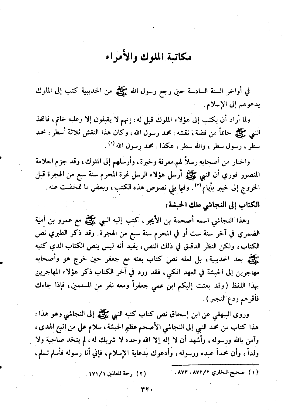 هذا كتاب من محمد النبي إلى النجاشي الأصحم عظيم الحبشة، سلام على من اتبع الهدى، وآمن بالله ورسوله، وأشهد ألاإله إلا الله وحده لا شريك له، لم يتخذ صاحبة ولا ولدا، وأن محمدا عبده ورسوله، وأدعوك بدعاية الإسلام، فإني أنا رسوله فأسلم