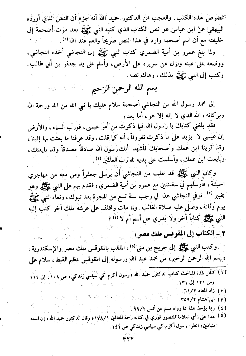 بسم الله الرحمن الرحيم إلى محمد رسول الله من النجاشي أصحمة سلام عليك يا نبي الله من الله ورحمة الله وبركاته، الله الذي لا إله إلا هو، أما بعد: