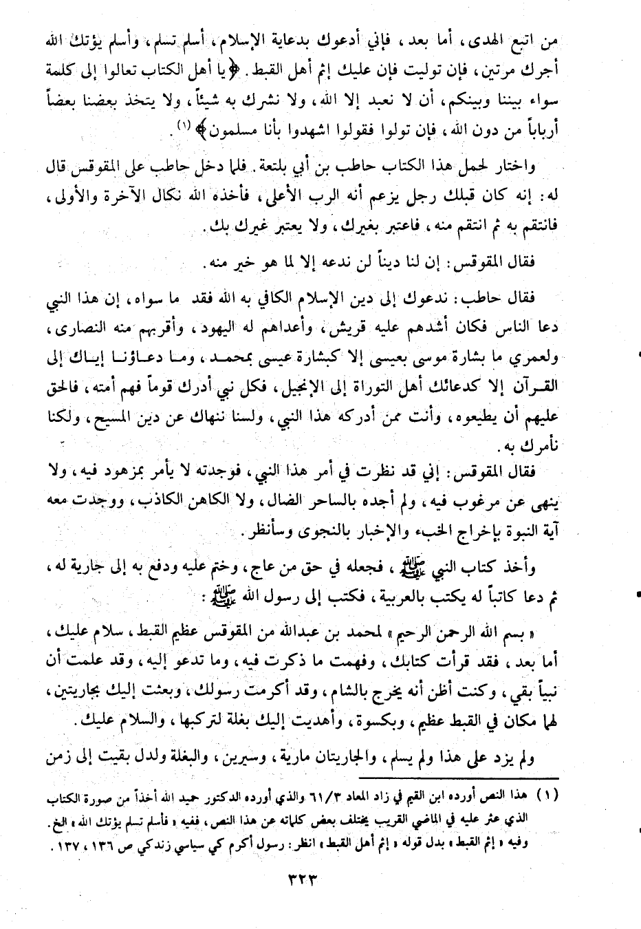 (1) هذا النص أورده ابن القيم في زاد المعاد 3/ 61 والذي أورده الدكتور حميد الله أخذا من صورة الكتاب الذي عثر عليه في الماضي القريب يختلف بعض كلماته عن هذا النص، ففيه: «فأسلم تسلم يؤتك الله» الخ. وفيه: «إثم القبط» بدل قوله: «إثم أهل القبط» انظر: رسول أكرم كي سياسي زندكي ص 136، 137.