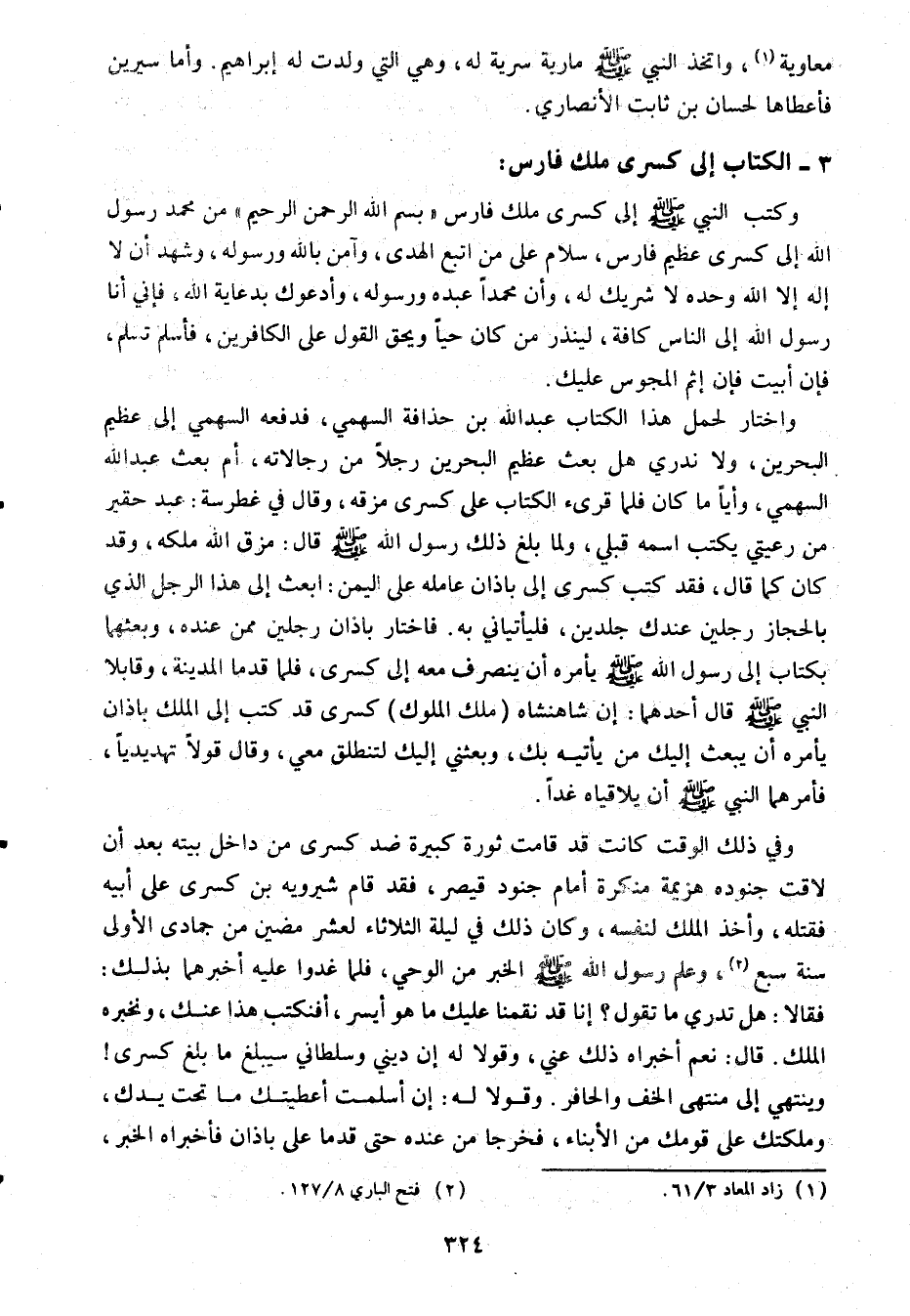 وكتب النبي صلى الله عليه وسلم إلى كسرى مالك فارس: «بسم الله الرحمن الرحيم» من محمد رسول الله إلى كسرى عظيم فارس، سلام على من اتبع الهدى، وآمن بالله ورسوله، وشهد ألاإله إلا الله وحده لا شريك له، وأن محمدا عبده ورسوله، وأدعوك بدعاية الله، فإني أنا رسول الله إلى الناس كافة، لينذر من كان حيا ويحق القول على الكافرين، فأسلم تسلم، فإن أبيت فإن إثم المجوس عليك «2» .