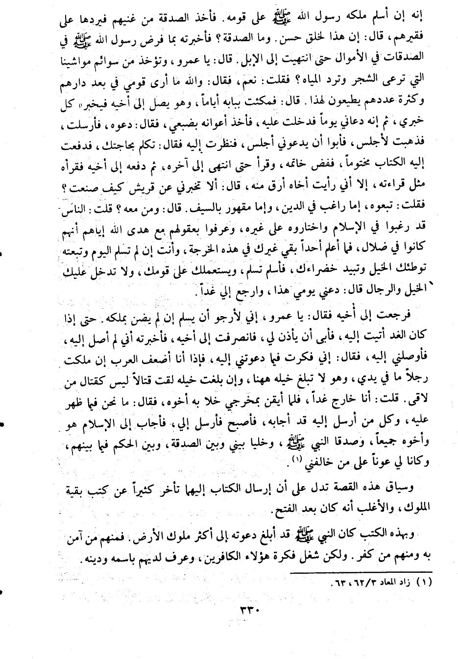 ولكن أخي أضن بملكه من أن يدعه ويصير ذنبا، قلت: إنه إن أسلم ملكه رسول الله صلى الله عليه وسلم على قومه. فأخذ الصدقة من غنيهم فيردها على فقيرهم، قال: إن هذا لخلق حسن. وما الصدقة؟ فأخبرته بما فرض رسول الله صلى الله عليه وسلم في الصدقات في الأموال حتى انتهيت إلى الإبل. قال: يا عمرو، وتؤخذ من سوائم مواشينا التي ترعى الشجر وترد المياه؟ فقلت: