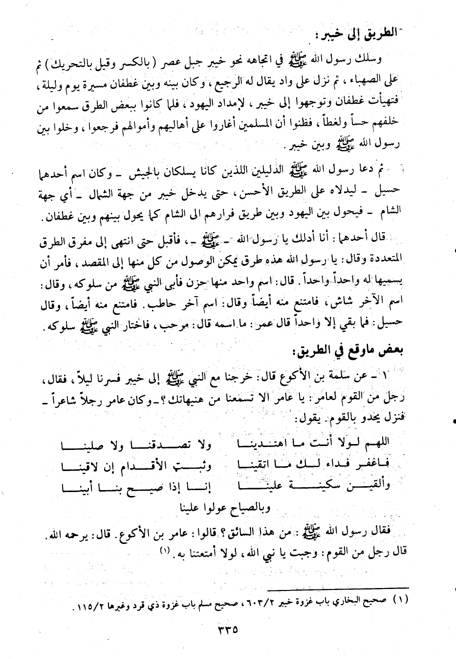 1- عن سلمة بن الأكوع قال: خرجنا مع النبي صلى الله عليه وسلم إلى خيبر فسرنا ليلا، فقال: رجل من القوم لعامر: يا عامر ألا تسمعنا من هنيهاتك؟ - وكان عامر رجلا شاعرا- فنزل يحدو بالقوم. يقول: