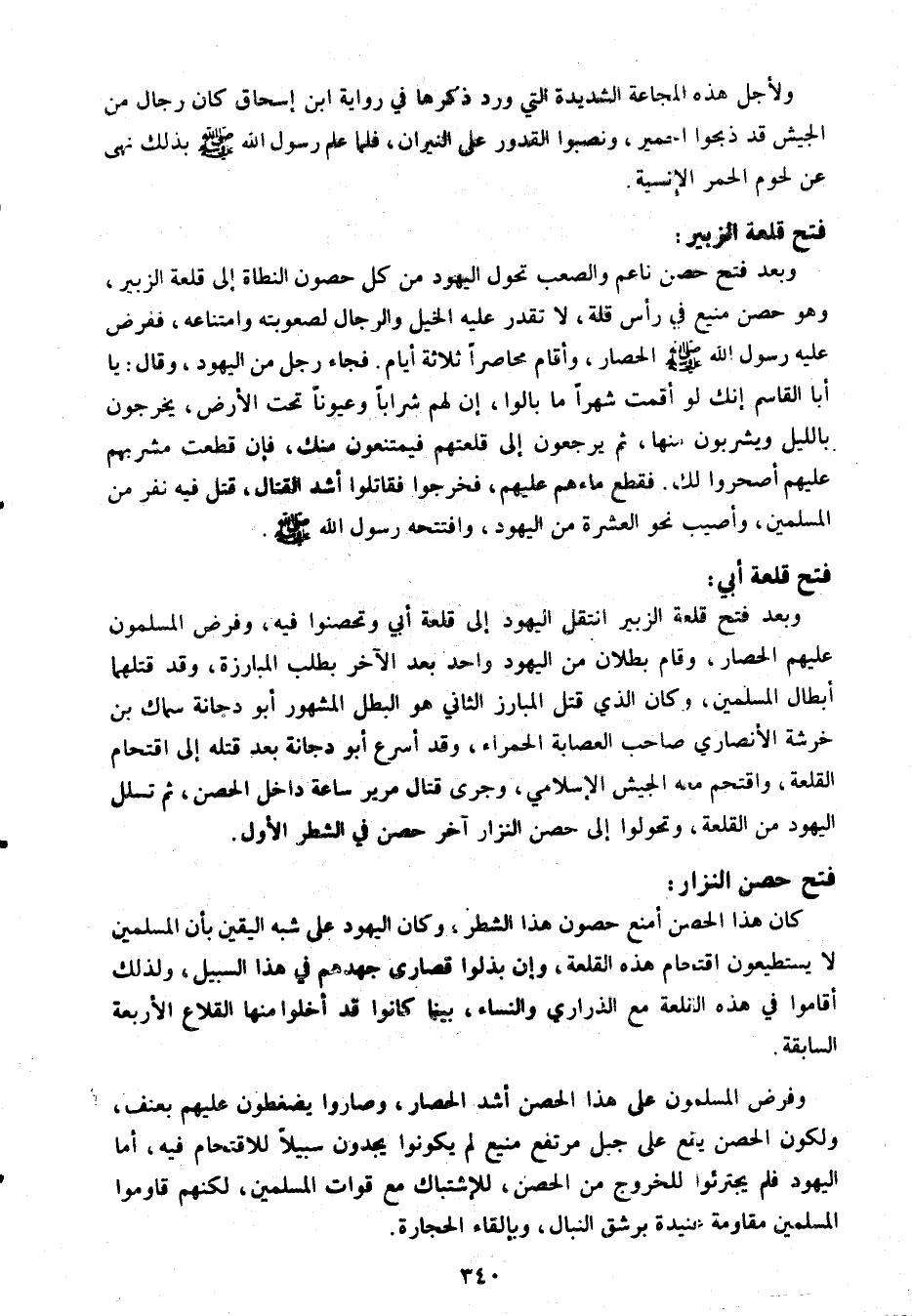 وبعد فتح حصن ناعم والصعب تحول اليهود من كل حصون النطاة إلى قلعة الزبير، وهو حصن منيع في رأس قلة، لا تقدر عليه الخيل والرجال لصعوبته وامتناعه، ففرض عليه رسول الله صلى الله عليه وسلم الحصار، وأقام محاصرا ثلاثة أيام. فجاء رجل من اليهود، وقال: يا أبا القاسم إنك لو أقمت شهرا ما بالوا، إن لهم شرابا وعيونا تحت الأرض، يخرجون بالليل ويشربون منها، ثم يرجعون إلى قلعتهم فيمتنعون منك، فإن قطعت مشربهم عليهم أصحروا لك. فقطع ماءهم عليهم، فخرجوا فقاتلوا أشد القتال، قتل فيه نفر من المسلمين، وأصيب نحو العشرة من اليهود، وافتتحه رسول الله صلى الله عليه وسلم