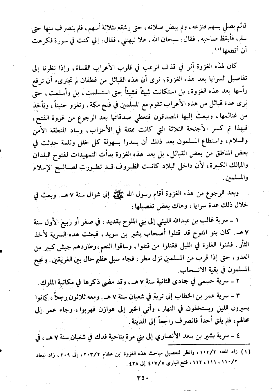 (1) زاد المعاد 2/ 112، وانظر لتفصيل مباحث هذه الغزوة ابن هشام 2/ 203، إلى 209، زاد المعاد 2/ 110، 111، 112، فتح الباري 7/ 417 إلى 428.