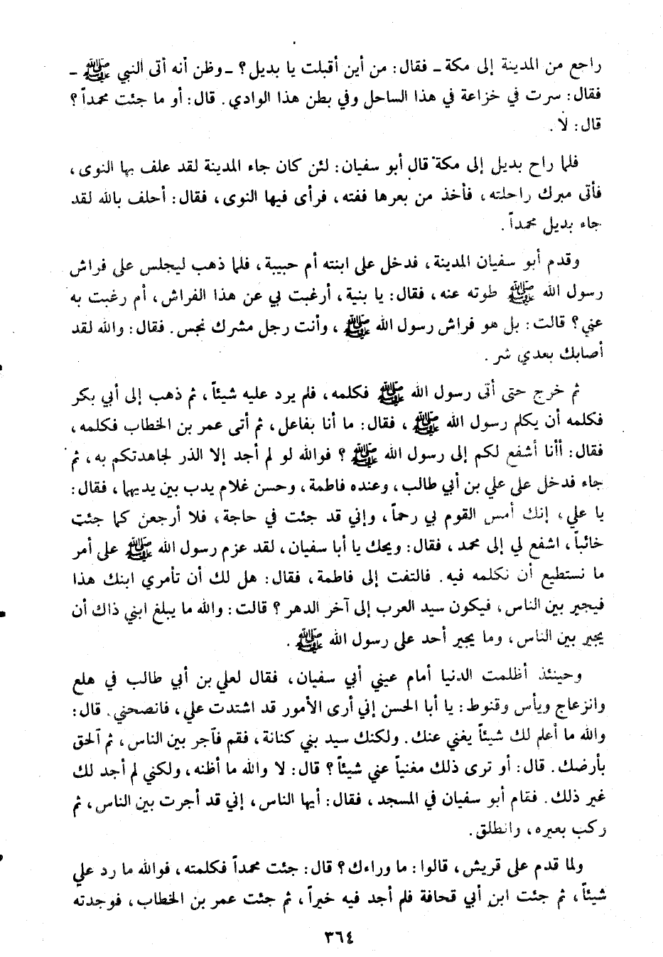 ثم خرج حتى أتى رسول الله صلى الله عليه وسلم فكلمه، فلم يرد عليه شيئا، ثم ذهب إلى أبي بكر فكلمه أن يكلم رسول الله صلى الله عليه وسلم، فقال: ما أن بفاعل، ثم أتى عمر بن الخطاب فكلمه، فقال: أأنا أشفع لكم إلى رسول الله صلى الله عليه وسلم؟ فو الله لو لم أجد إلا الذر لجاهدتكم به، ثم جاء فدخل على علي بن أبي طالب، وعنده فاطمة، وحسن غلام يدب بين يديهما، فقال: يا علي، إنك أمس القوم بي رحما، وإني قد جئت في حاجة، فلا أرجعن كما جئت خائبا، اشفع لي إلى محمد، فقال: ويحك يا أبا سفيان، لقد عزم رسول الله صلى الله عليه وسلم على أمر ما نستطيع أن نكلمه فيه. فالتفت إلى فاطمة، فقال: هل لك أن تأمري ابنك هذا فيجير بين الناس، فيكون سيد العرب إلى آخر الدهر؟ قالت: والله ما يبلغ ابني ذاك أن يجير بين الناس، وما يجير أحد على رسول الله صلى الله عليه وسلم.