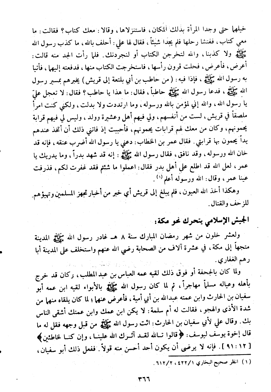 فأعرض، فحلت قرون رأسها، فاستخرجت الكتاب منها، فدفعته إليهما، فأتيا به رسول الله صلى الله عليه وسلم، فإذا فيه: (من حاطب بن أبي بلتعة إلى قريش) يخبرهم بمسير رسول الله صلى الله عليه وسلم، فدعا رسول الله صلى الله عليه وسلم حاطبا، فقال: ما هذا يا حاطب؟ فقال: لا تعجل عليّ يا رسول الله، والله إني لمؤمن بالله ورسوله، وما ارتددت ولا بدلت، ولكني كنت امرأ ملصقا في قريش، لست من أنفسهم، ولي فيهم أهل وعشيرة وولد، وليس لي فيهم قرابة يحمونهم، وكان من معك لهم قرابات يحمونهم، فأحببت إذ فاتني ذلك أن أتخذ عندهم يدا يحمون بها قرابتي. فقال عمر بن الخطاب: دعني يا رسول الله أضرب عنقه، فإنه قد خان الله ورسوله، وقد نافق، فقال رسول الله صلى الله عليه وسلم: «إنه قد شهد بدرا، وما يدريك يا عمر، لعل الله قد اطلع على أهل بدر فقال: اعملوا ما شئتم فقد غفرت لكم» ، فذرفت عينا عمر، وقال: الله ورسوله أعلم «1» .