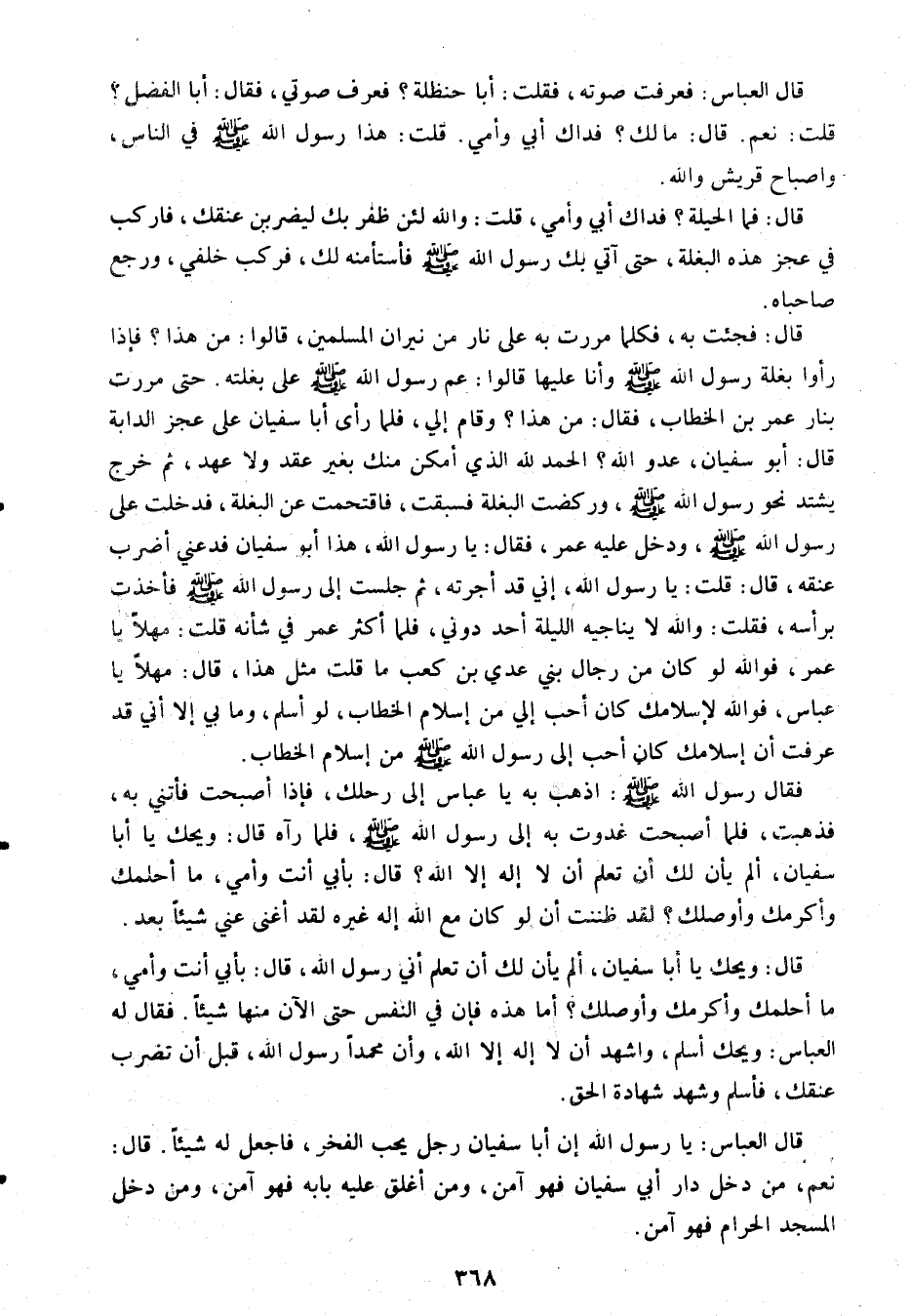 قال: فجئت به، فكلما مررت به على نار من نيران المسلمين، قالوا: من هذا؟ فإذا رأوا بغلة رسول الله صلى الله عليه وسلم وأنا عليها قالوا: عم رسول الله صلى الله عليه وسلم على بغلته. حتى مررت بنار عمر بن الخطاب، فقال: من هذا؟ وقام إلي، فلما رأى أبا سفيان على عجز الدابة قال: أبو سفيان، عدو الله؟ الحمد لله الذي أمكن منك بغير عقد ولا عهد، ثم خرج يشتد نحو رسول الله صلى الله عليه وسلم، وركضت البغلة فسبقت، فاقتحمت عن البغلة، فدخلت على رسول الله صلى الله عليه وسلم، ودخل عليه عمر، فقال: يا رسول الله، هذا أبو سفيان فدعني أضرب عنقه، قال: قلت: يا رسول الله، إني قد أجرته، ثم جلست إلى رسول الله صلى الله عليه وسلم فأخذت برأسه، فقلت: والله لا يناجيه الليلة أحد دوني، فلما أكثر عمر في شأنه قلت: مهلا يا عمر، فو الله لو كان من رجال بني عدي بن كعب ما قلت مثل هذا، قال: مهلا يا عباس، فو الله لإسلامك كان أحب إلي من إسلام الخطاب، لو أسلم، وما بي إلا أني قد عرفت أن إسلامك كان أحب إلى رسول الله صلى الله عليه وسلم من إسلام الخطاب.