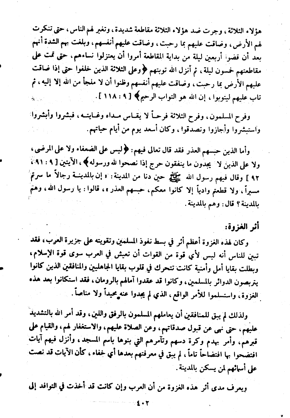 الثلاثة، وجرت ضد هؤلاء الثلاثة مقاطعة شديدة، وتغير لهم الناس، حتى تنكرت لهم الأرض، وضاقت عليهم بما رحبت، وضاقت عليهم أنفسهم، وبلغت بهم الشدة أنهم بعد أن قضوا أربعين ليلة من بداية المقاطعة أمروا أن يعتزلوا نساءهم، حتى تمت على مقاطعتهم خمسون ليلة، ثم أنزل الله توبتهم وَعَلَى الثَّلاثَةِ الَّذِينَ خُلِّفُوا حَتَّى إِذا ضاقَتْ عَلَيْهِمُ الْأَرْضُ بِما رَحُبَتْ، وَضاقَتْ عَلَيْهِمْ أَنْفُسُهُمْ وَظَنُّوا أَنْ لا مَلْجَأَ مِنَ اللَّهِ إِلَّا إِلَيْهِ، ثُمَّ تابَ عَلَيْهِمْ لِيَتُوبُوا، إِنَّ اللَّهَ هُوَ التَّوَّابُ الرَّحِيمُ [التوبة: 118] .