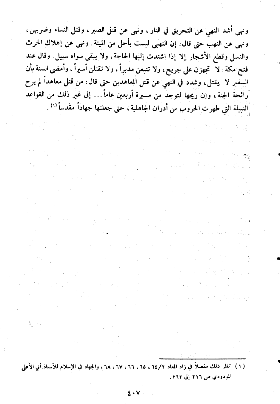 «إن النهبى ليست بأحل من الميتة» ونهى عن إهلاك الحرث والنسل وقطع الأشجار إلا إذا اشتدت إليها الحاجة، ولا يبقى سواه سبيل. وقال عند فتح مكة: «لا تجهزن على جريح، ولا تتبعن مدبرا، ولا تقتلن أسيرا» وأمضى السنة بأن السفير لا يقتل، وشدد في النهي عن قتل المعاهدين حتى قال: «من قتل معاهدا لم يرح رائحة الجنة، وإن ريحها لتوجد من مسيرة أربعين عاما» ..